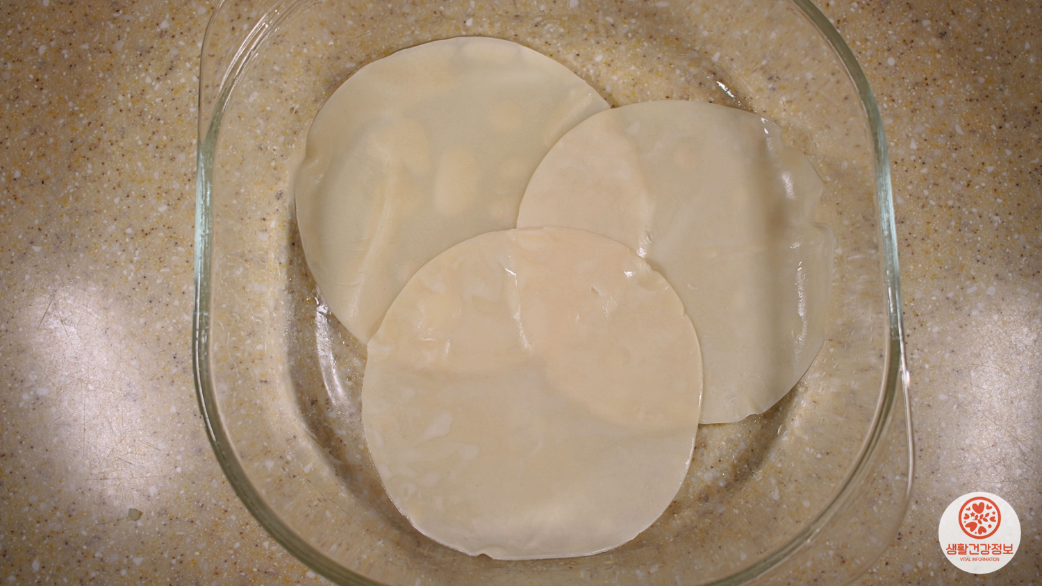 뜨거운물에 5초정도 담갔다 뺀 만두피를