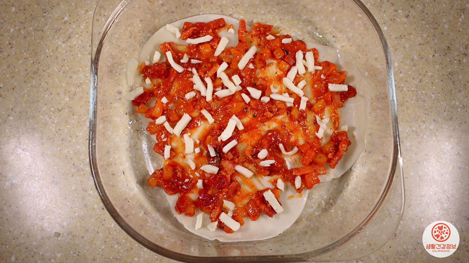 토마토소스에 양파, 파프리카, 베이컨을 추가해서