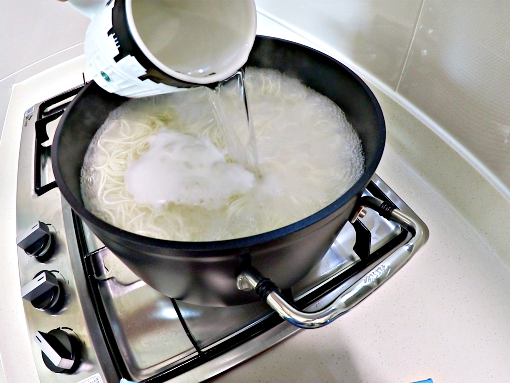 두번째 끓어오르면 찬물을 한컵 더 부어요.