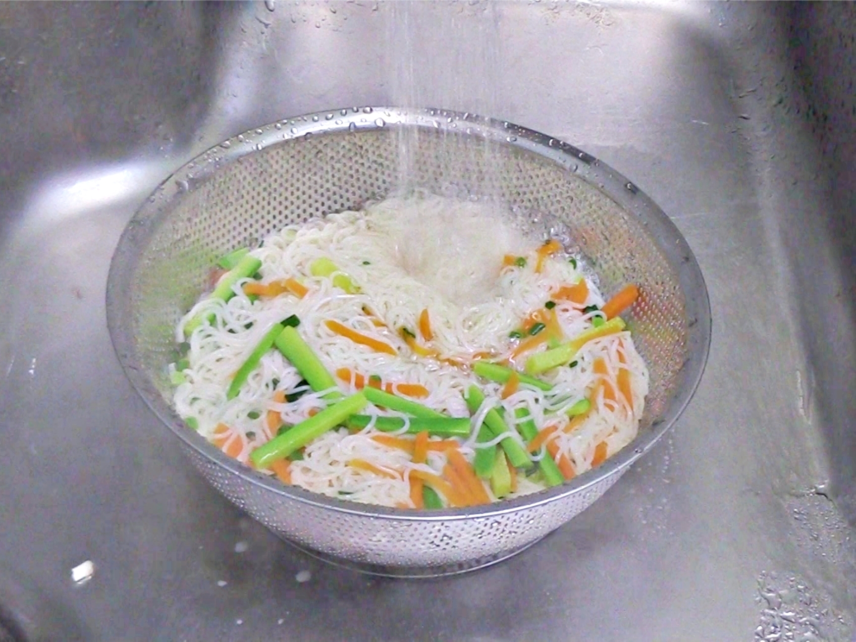 채반에 쏟아서 찬물로 충분히 헹궈주고요.