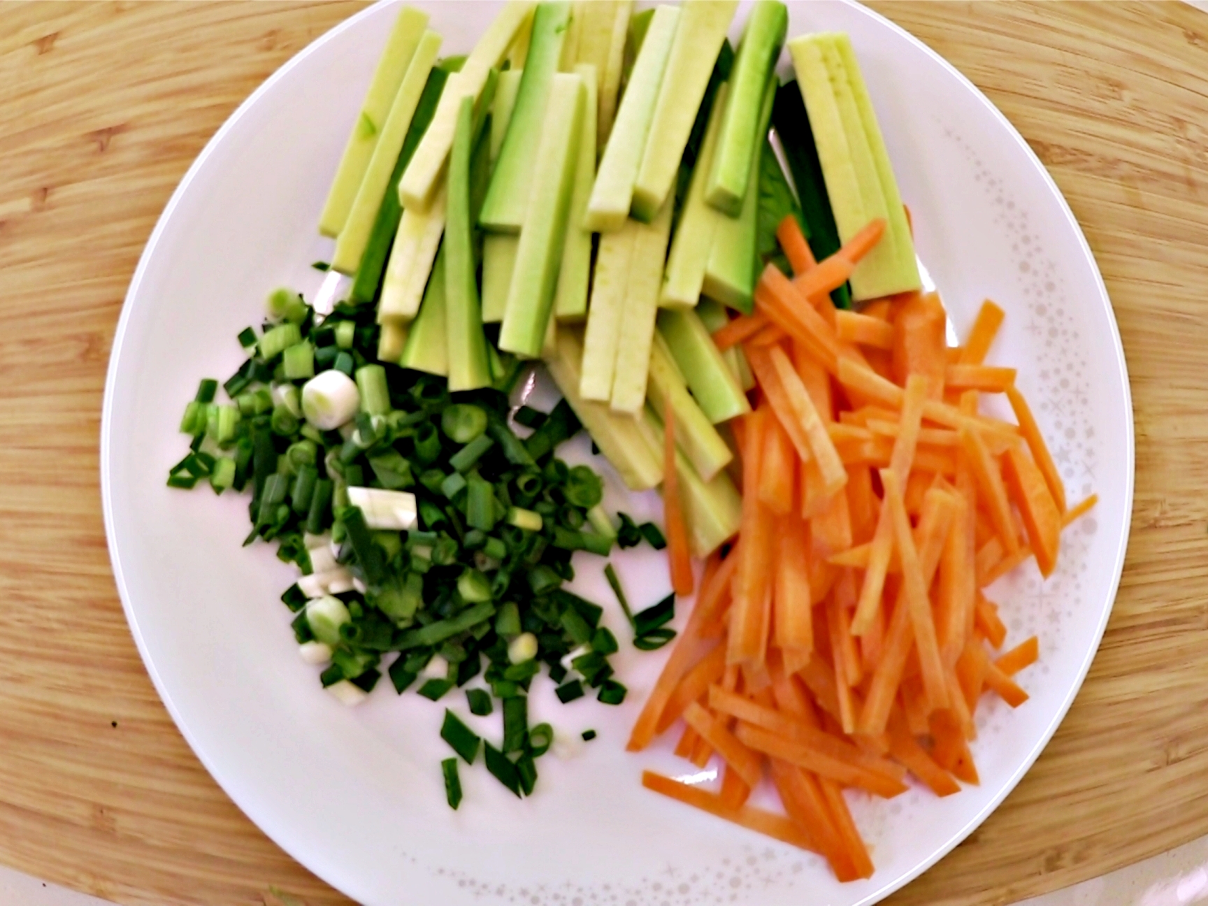 호박이랑 당근은 길쭉하게, 쪽파는 송송 썰어서 준비했어요.