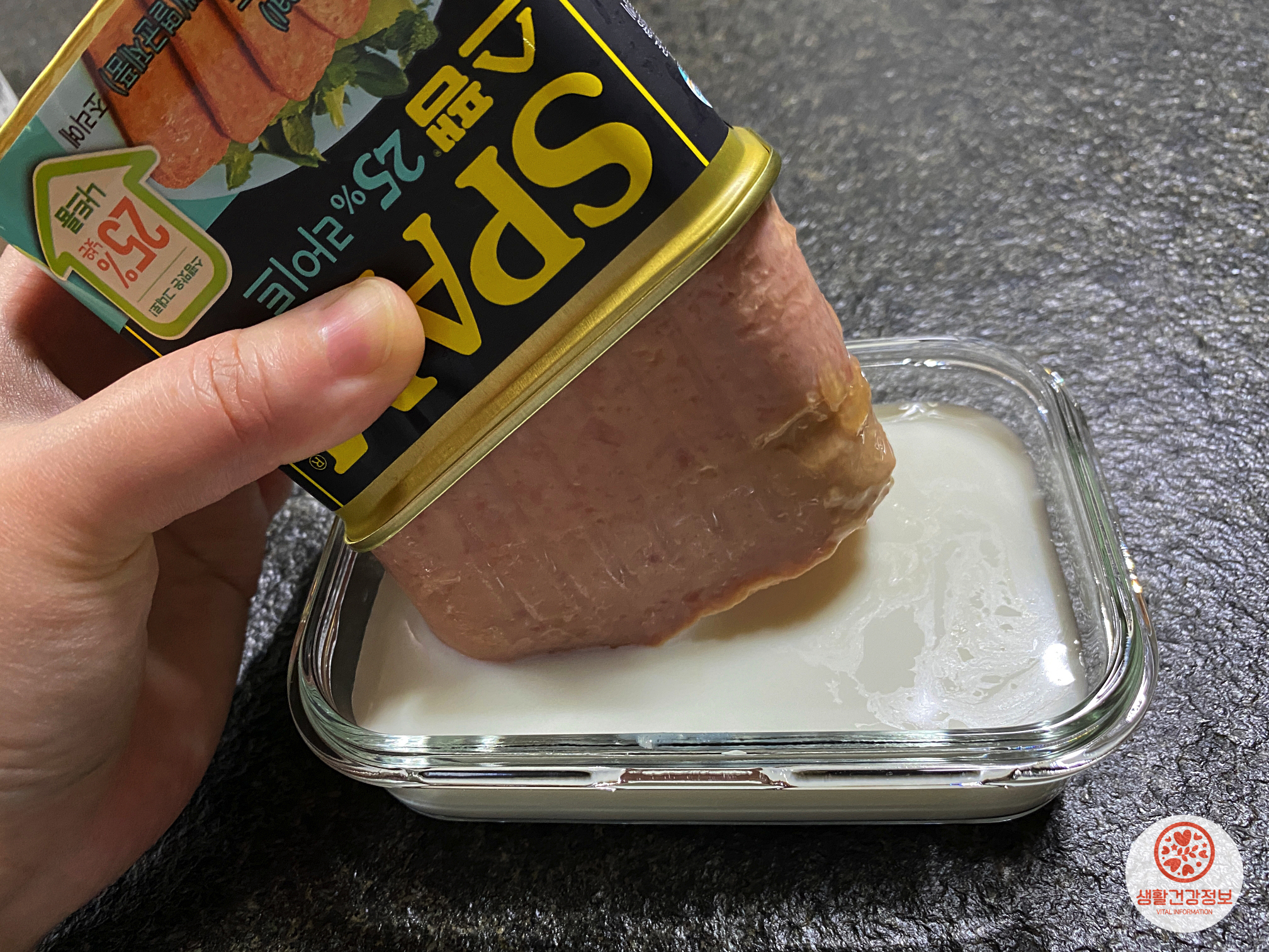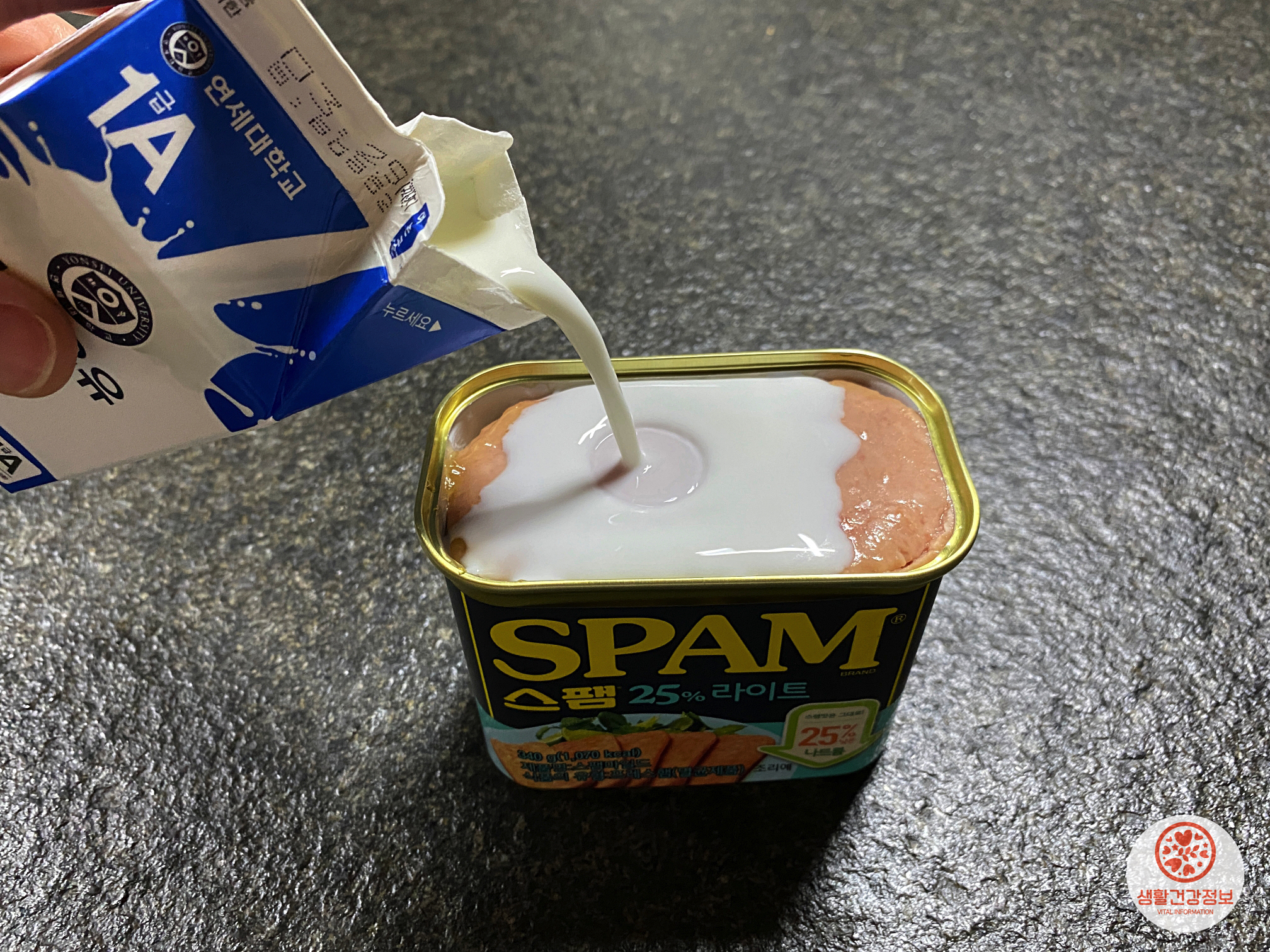 스팸이 우유 속에 푹 잠겨야 효과가 더 좋은데요.
