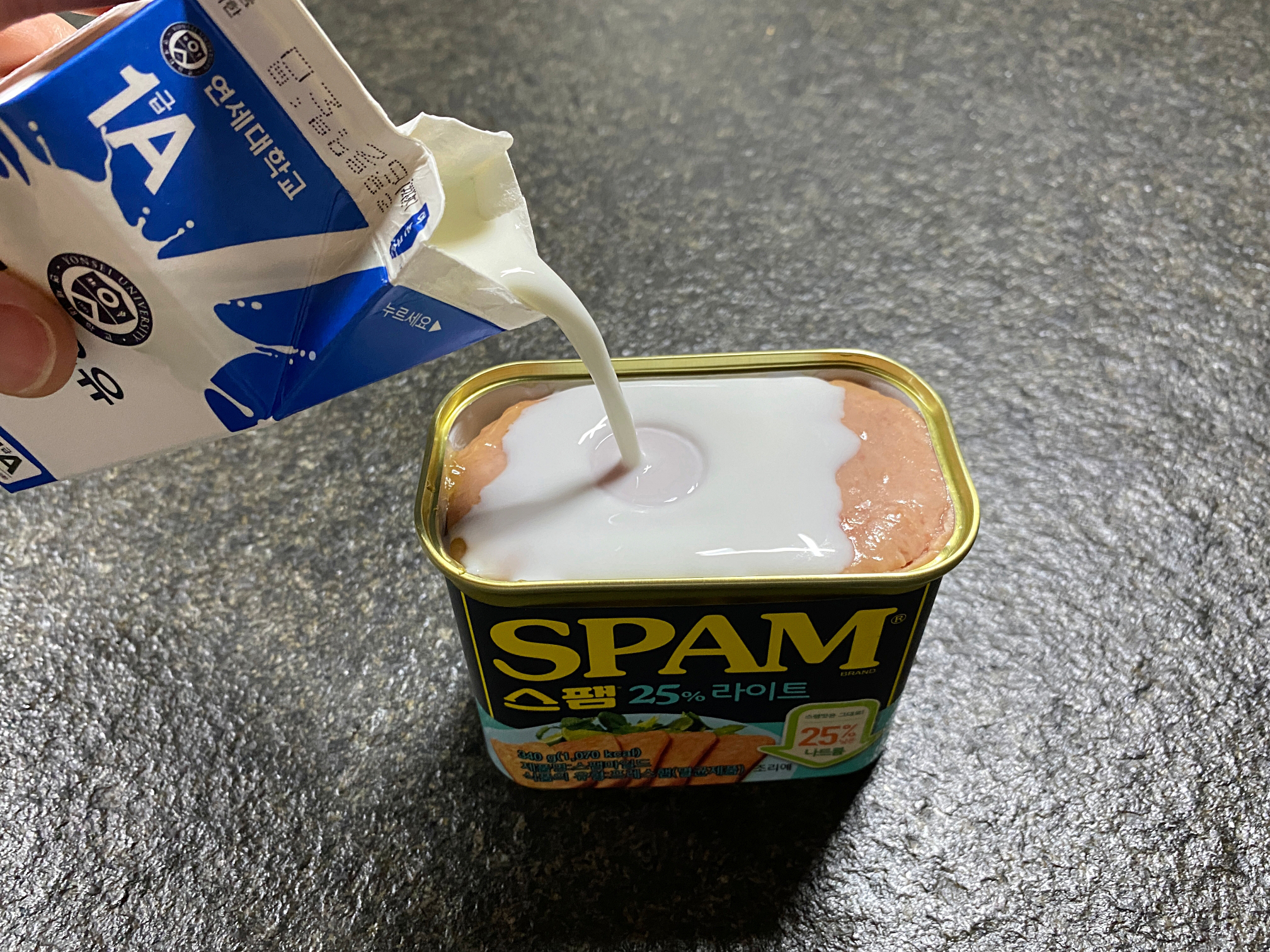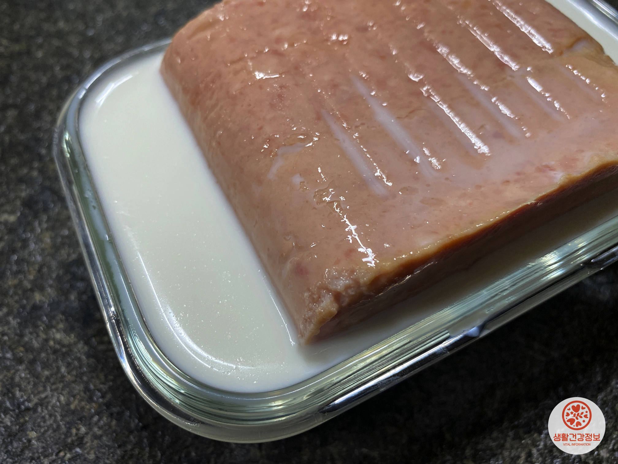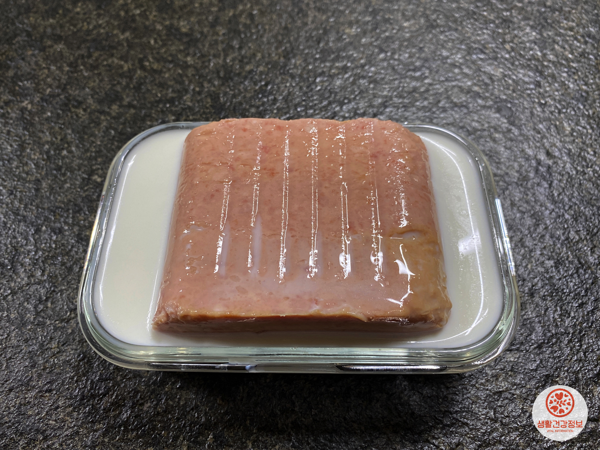 스팸이 우유 속에 푹 잠겨야 효과가 더 좋은데요.