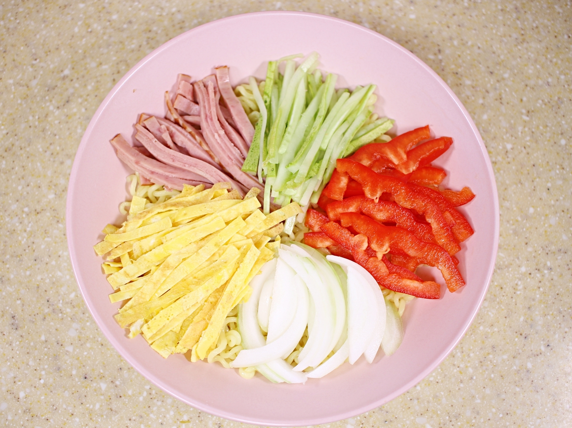 재료는 라면사리, 오이, 양파, 파프리카,
