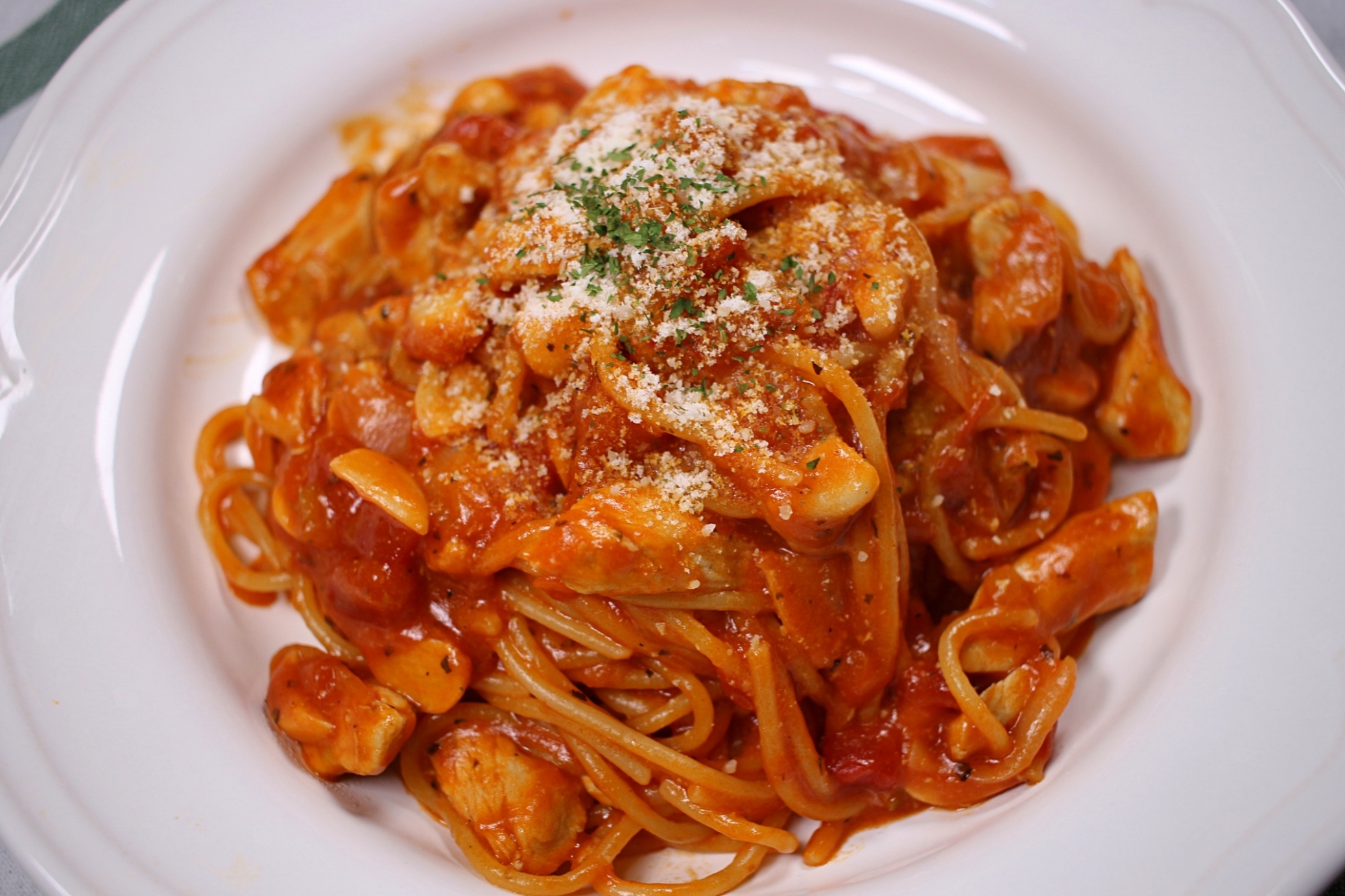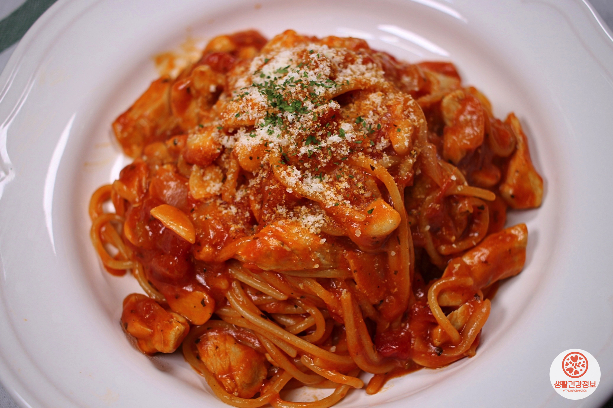 스파게티면, 토마토소스, 닭가슴살, 마늘, 양파
