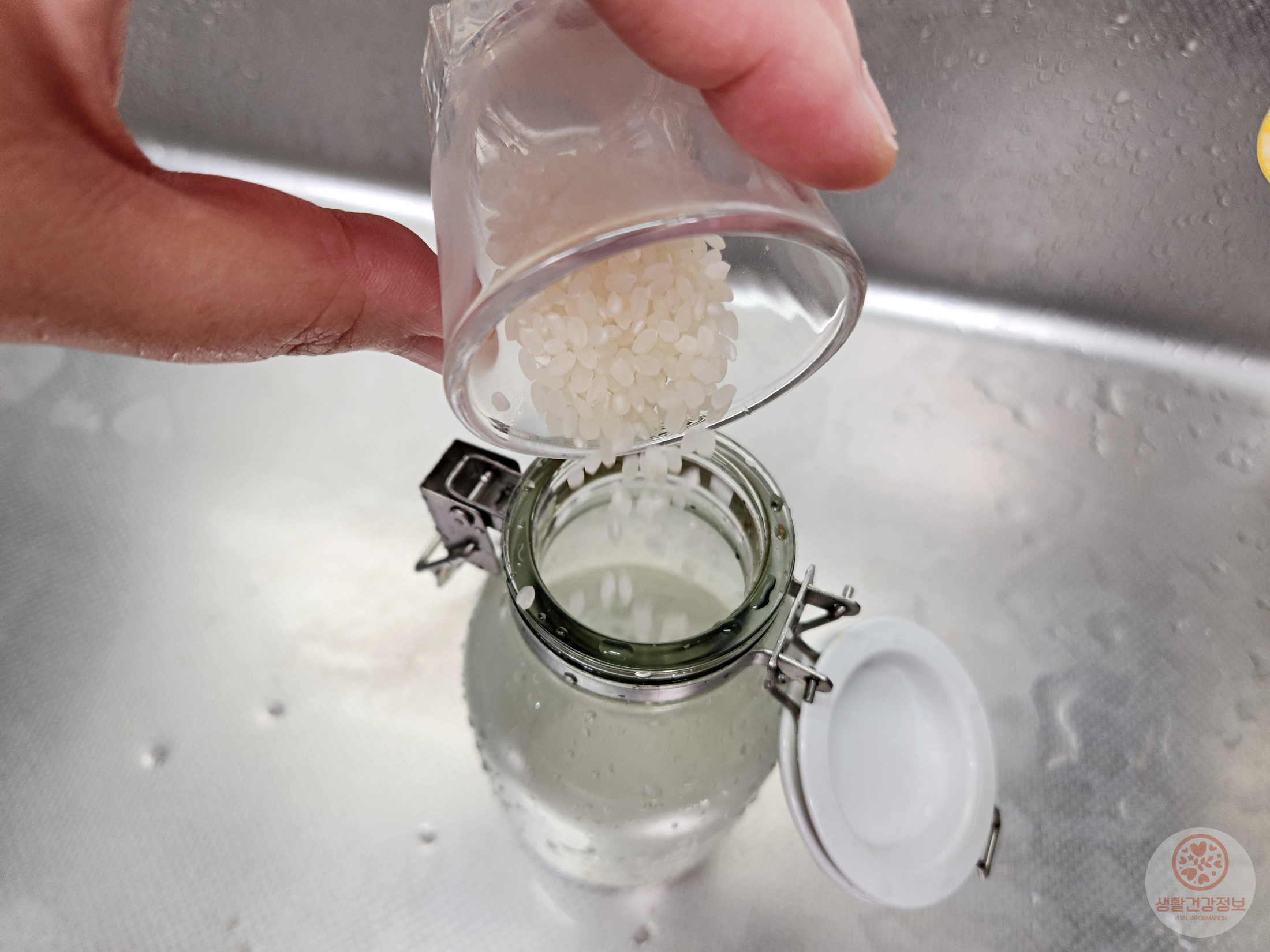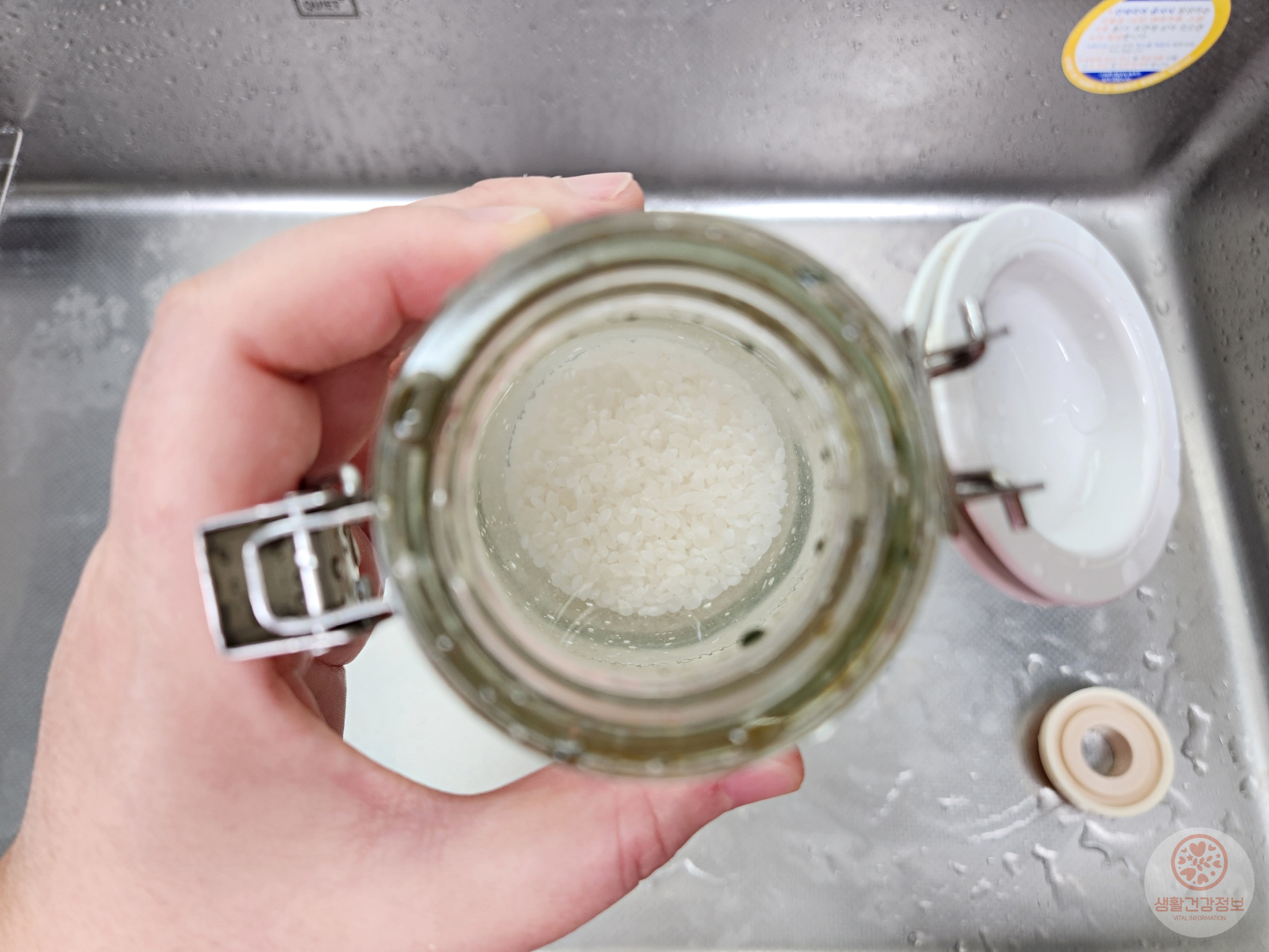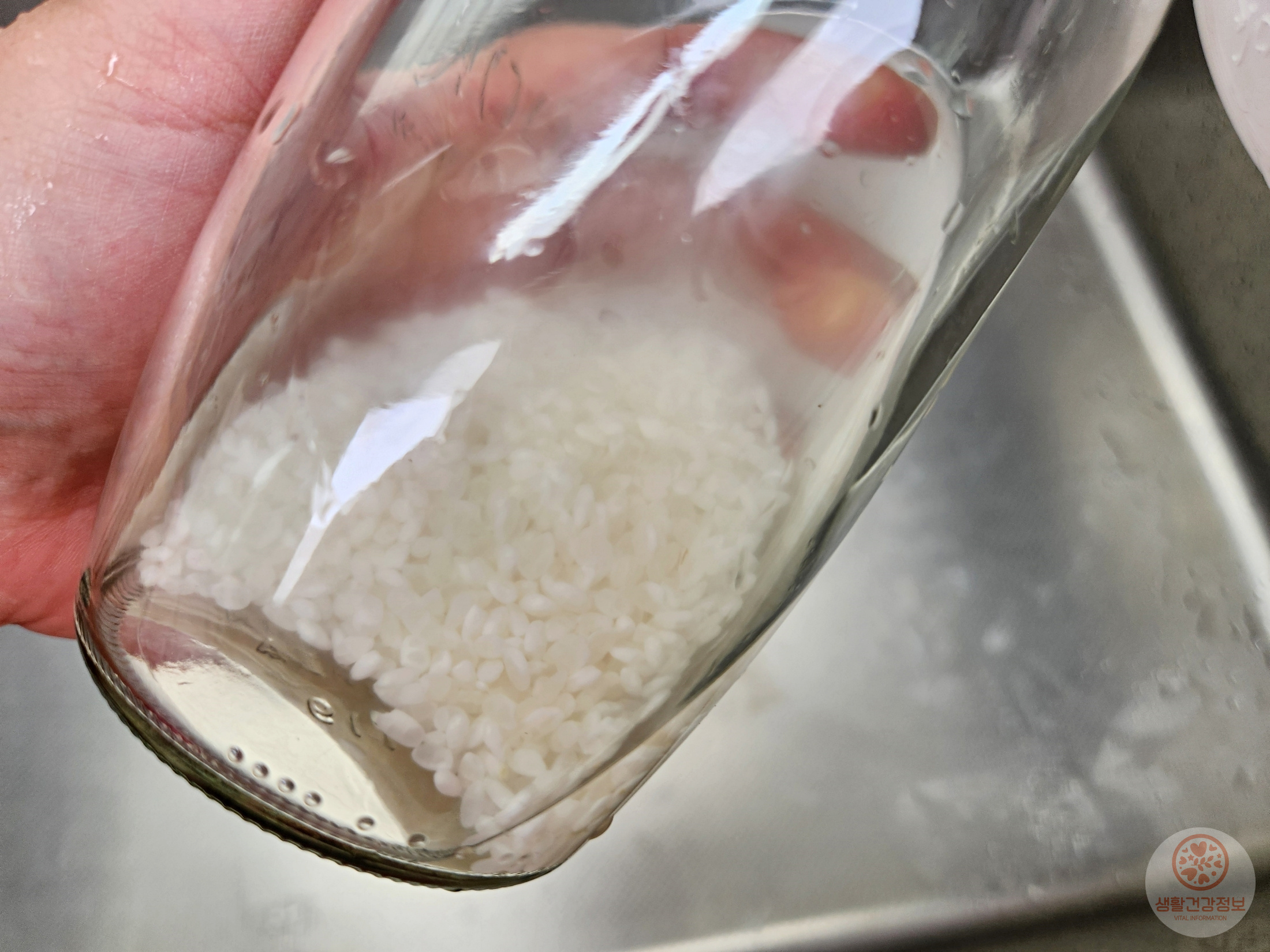 쌀이 기름병 구석구석 스치면서 기름때를 닦아내고요.