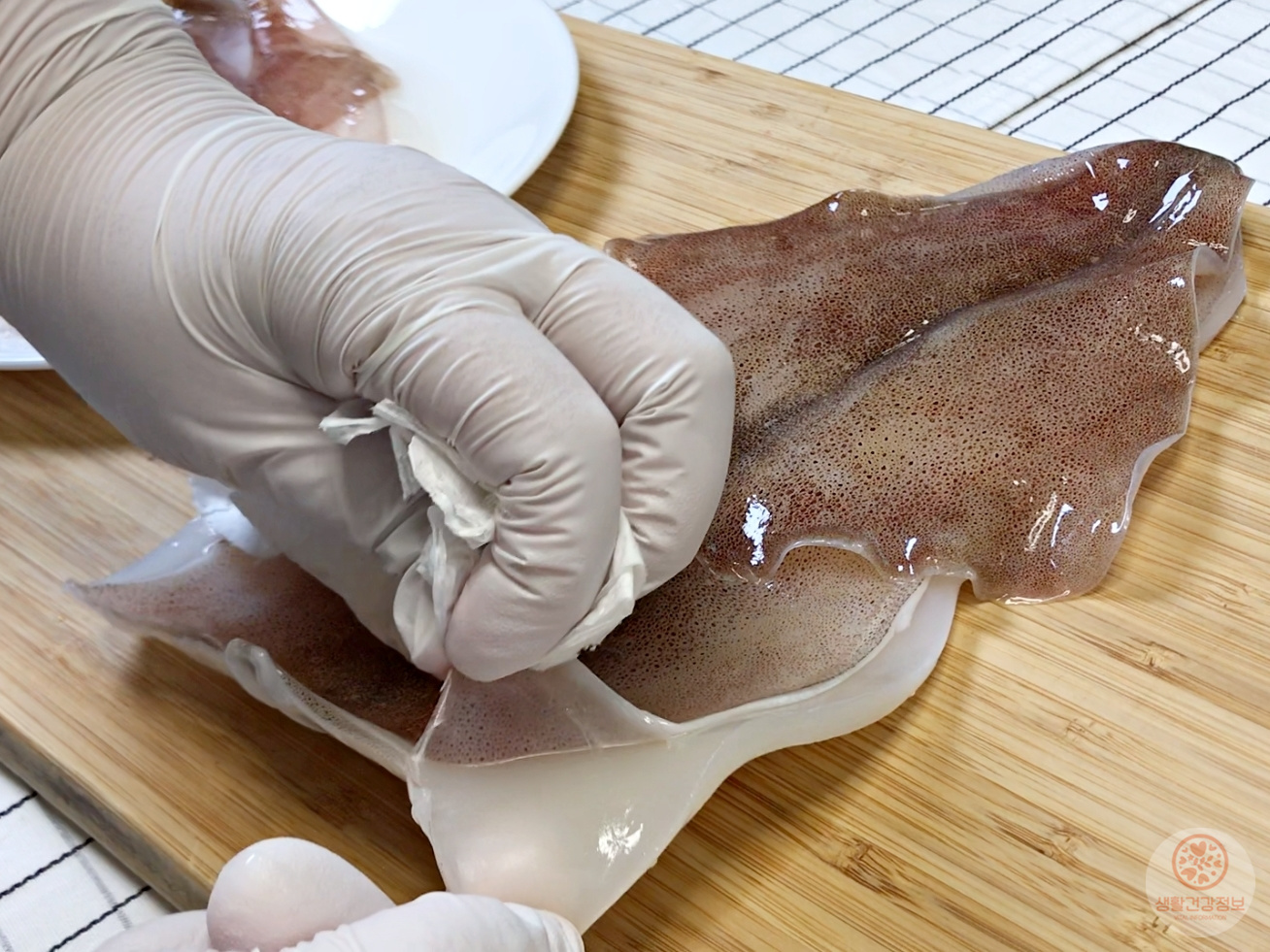 오징어를 깨끗하게 씻어서 껍질을 벗겨주세요.
