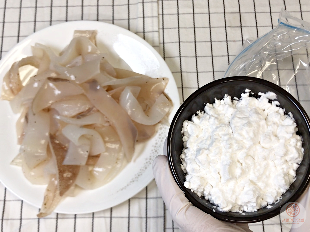 1차로 밑간한 오징어에 전분가루를 골고루 묻혀주세요.