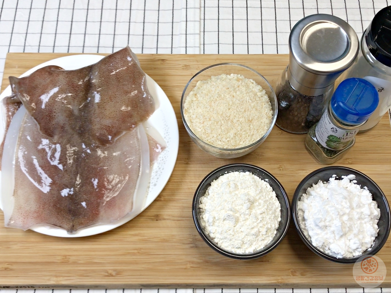 재료는 오징어, 전분가루, 튀김가루, 빵가루, 파슬리가루,