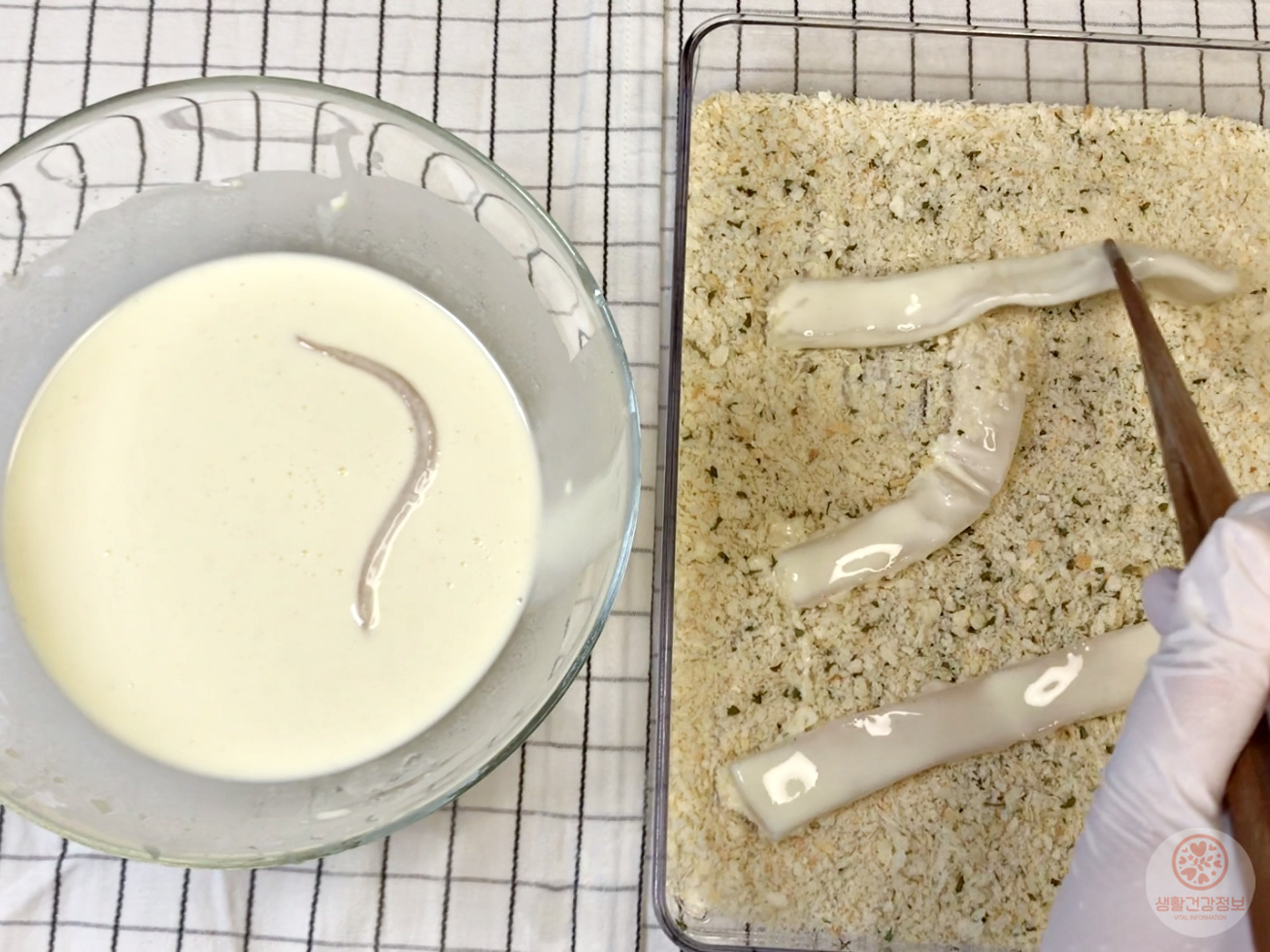 튀김반죽 입히고 빵가루 골고루 묻히면