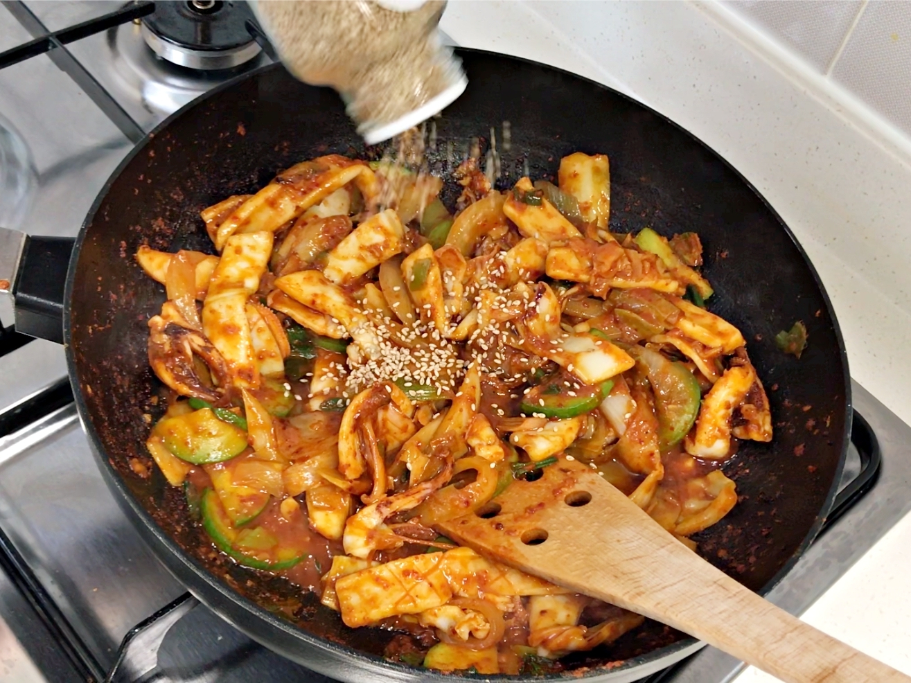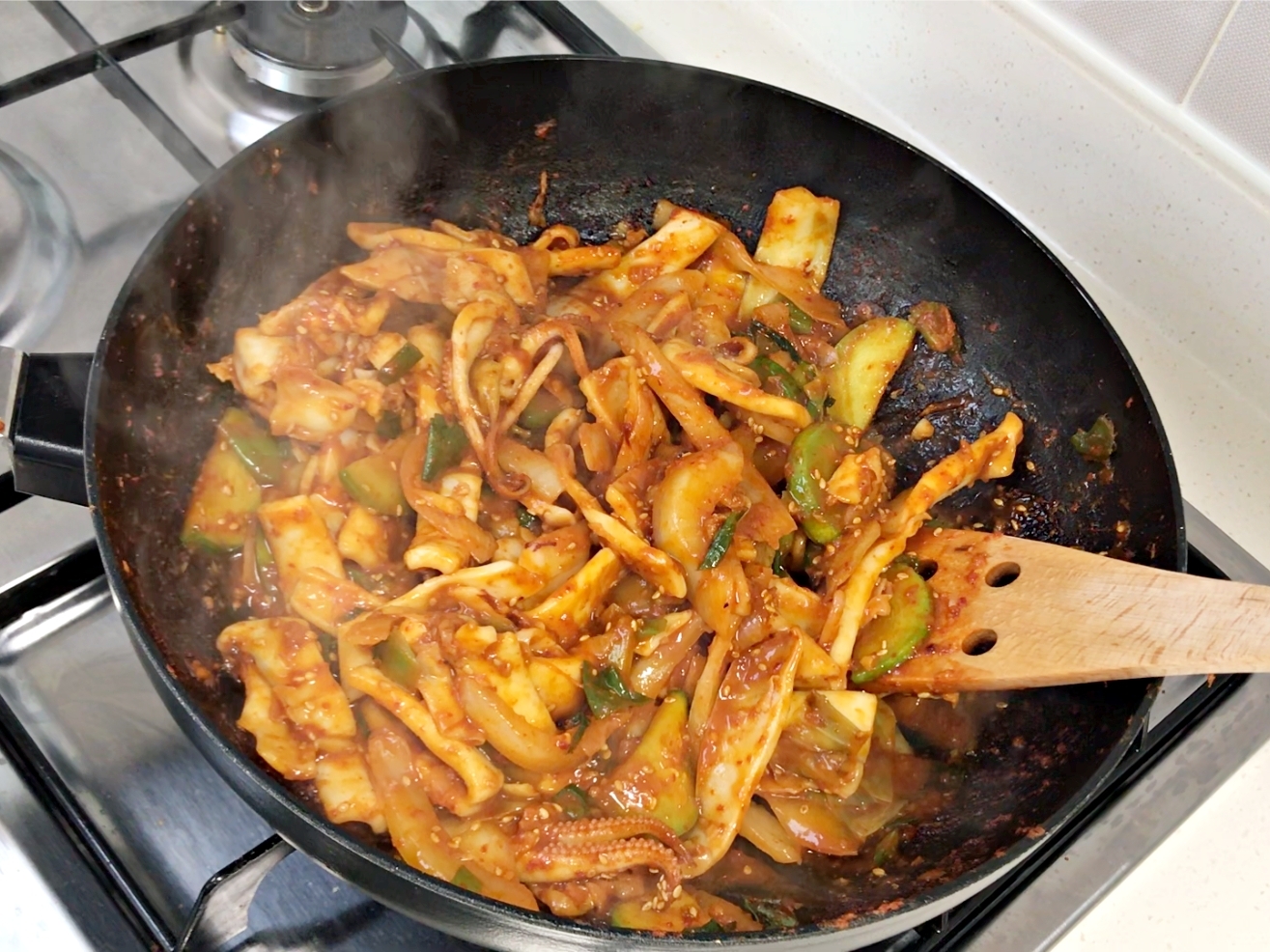 쫄깃한 오징어에 매콤달콤한 양념이 착 감기면