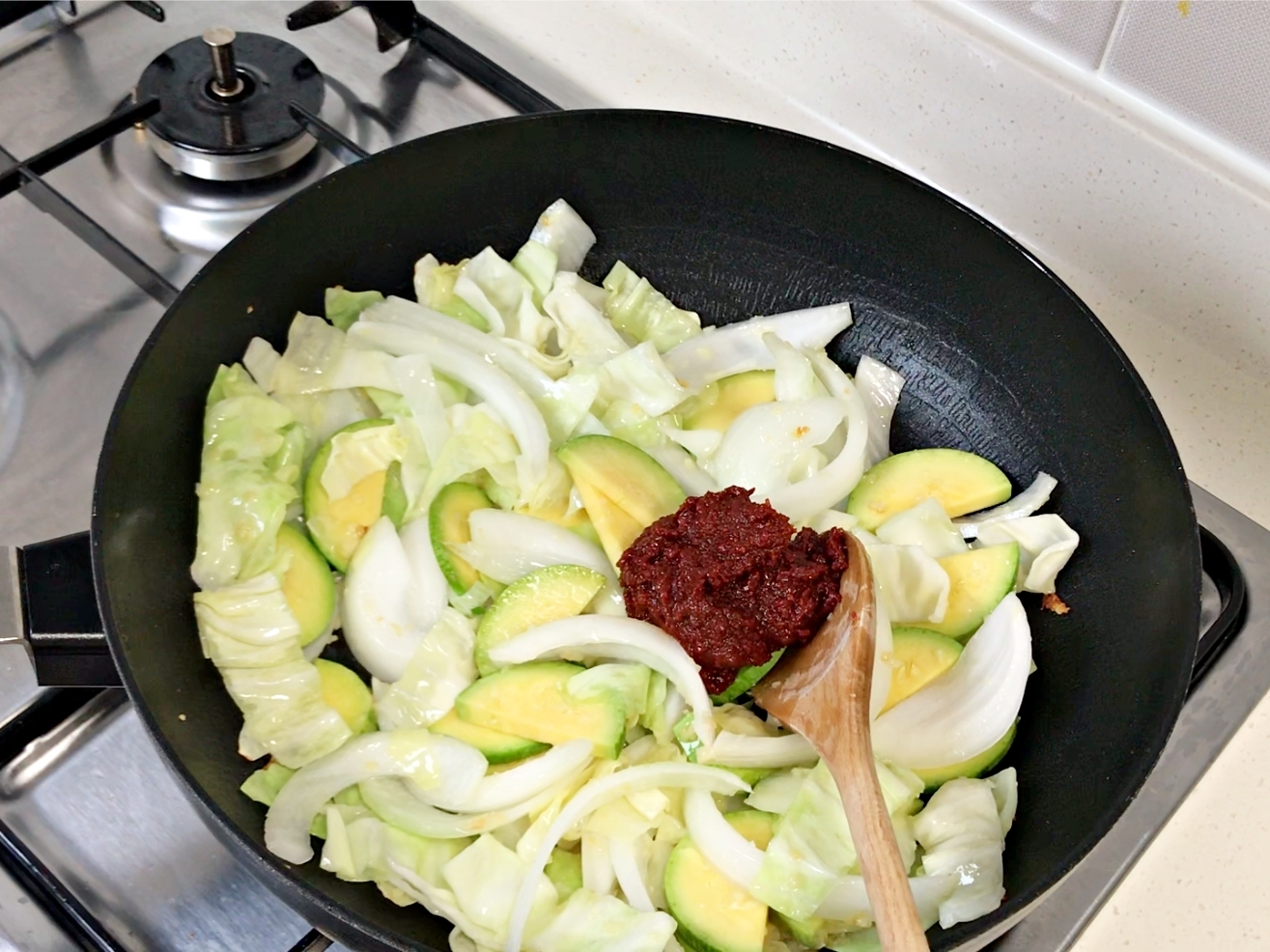 호박이 반쯤 익으면 남은 양념장을 넣어서 골고루 섞고요.