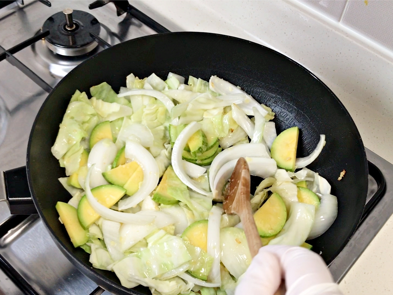 양파가 투명해지면 호박을 넣어서 볶아주세요.