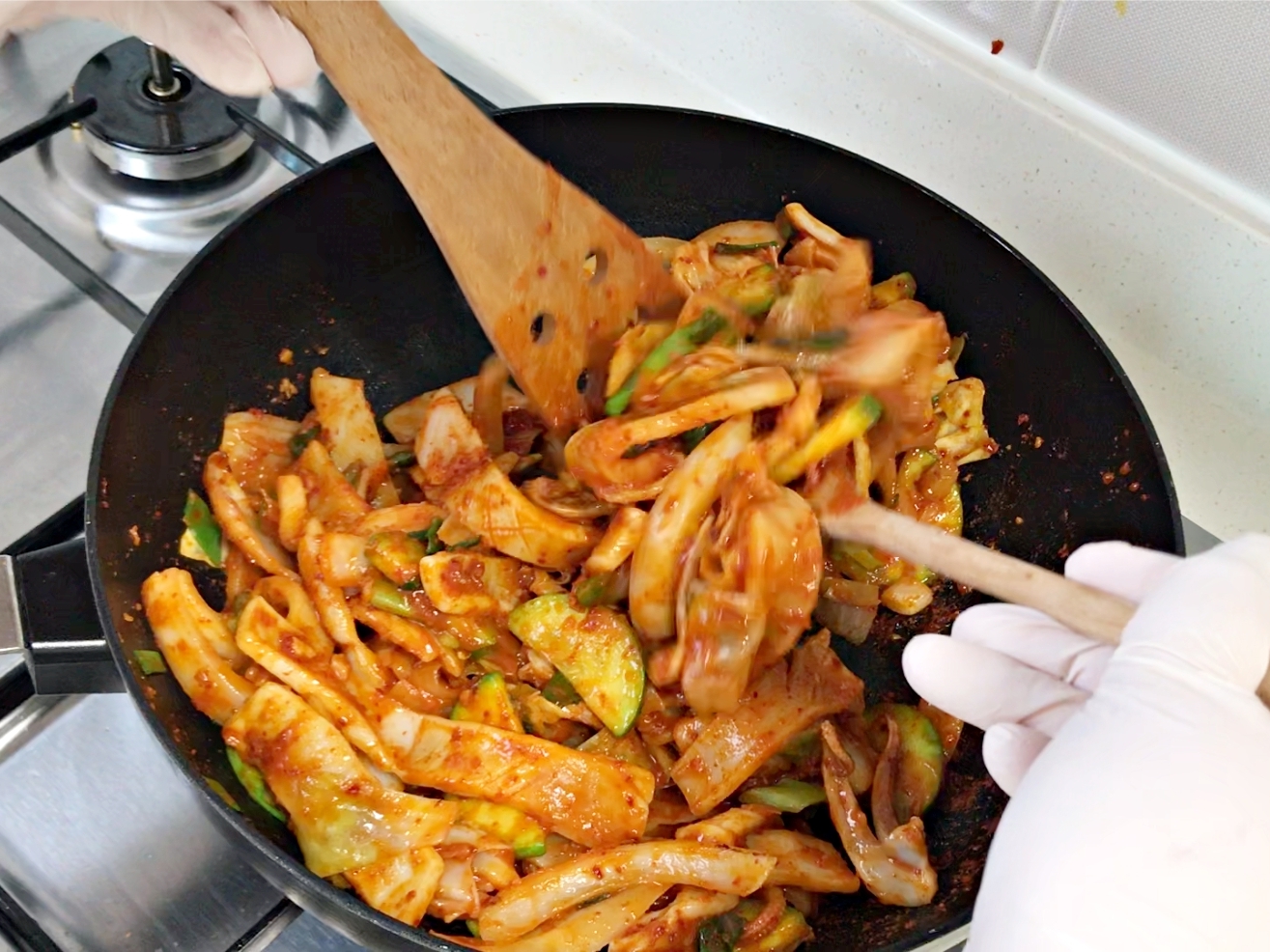 오징어를 넣고 센불에서 빠르게 볶아주시면 돼요.