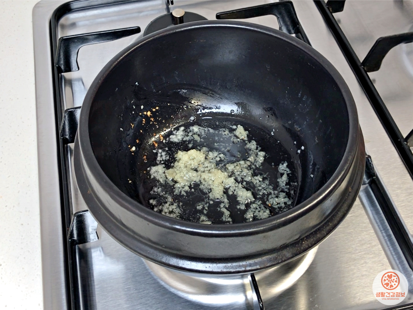 냄비에 기름을 두르고 마늘을 볶아주세요.