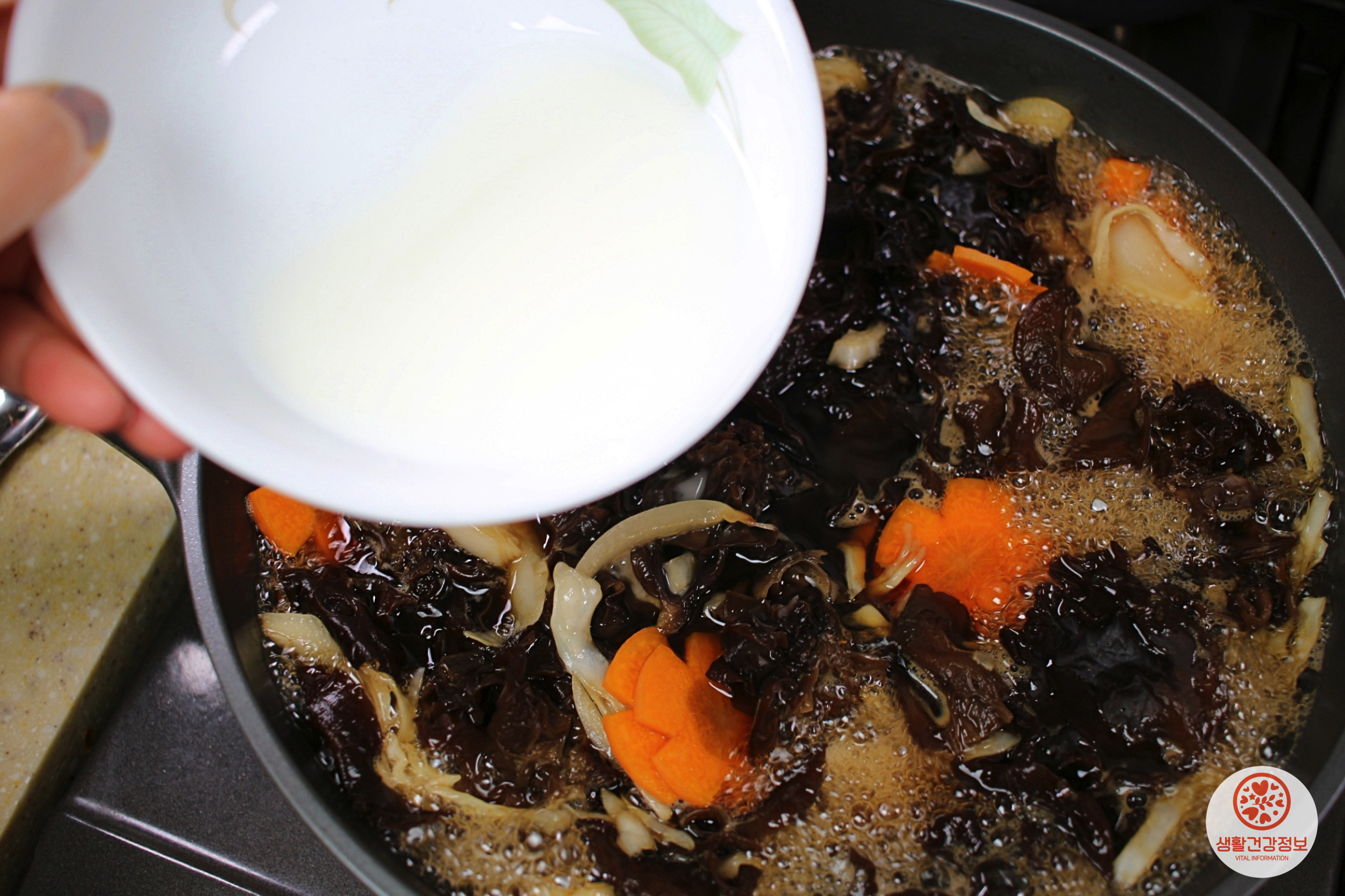 전분물로 농도를 맞추고 가스불을 꺼 주세요.