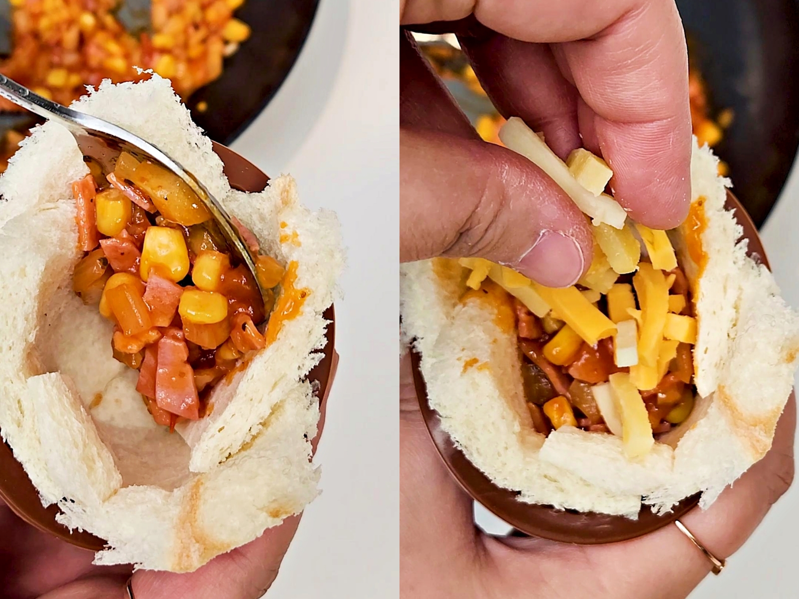 그 안에 방금 만든 피자 토핑을 듬뿍 채우고
