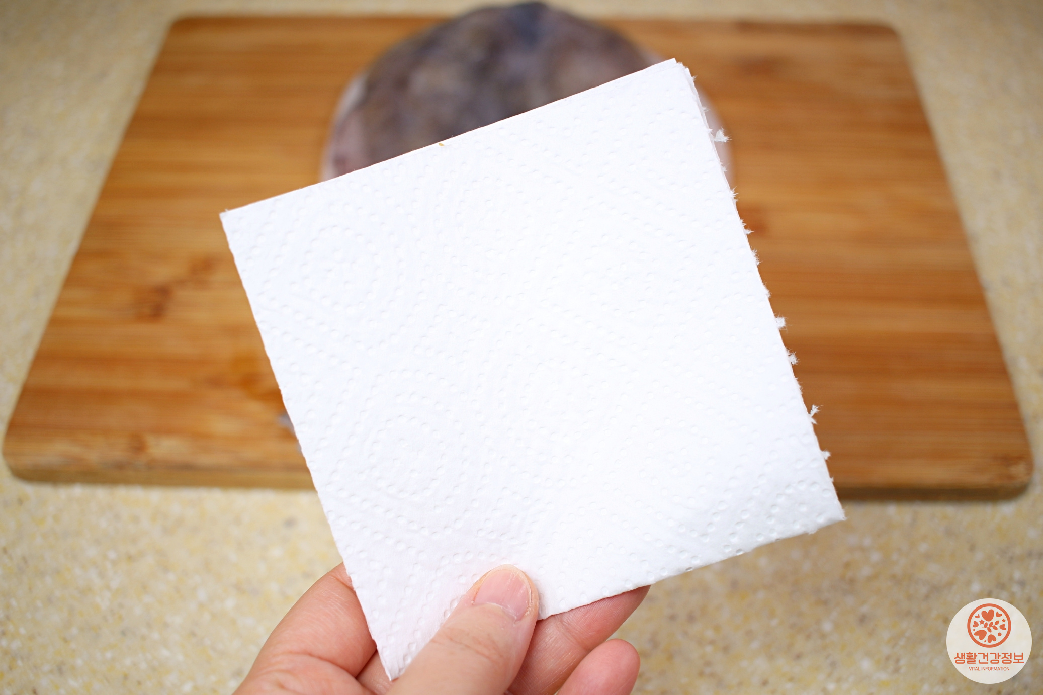키친타월로 오징어껍질 끄트머리를 밀어보세요.