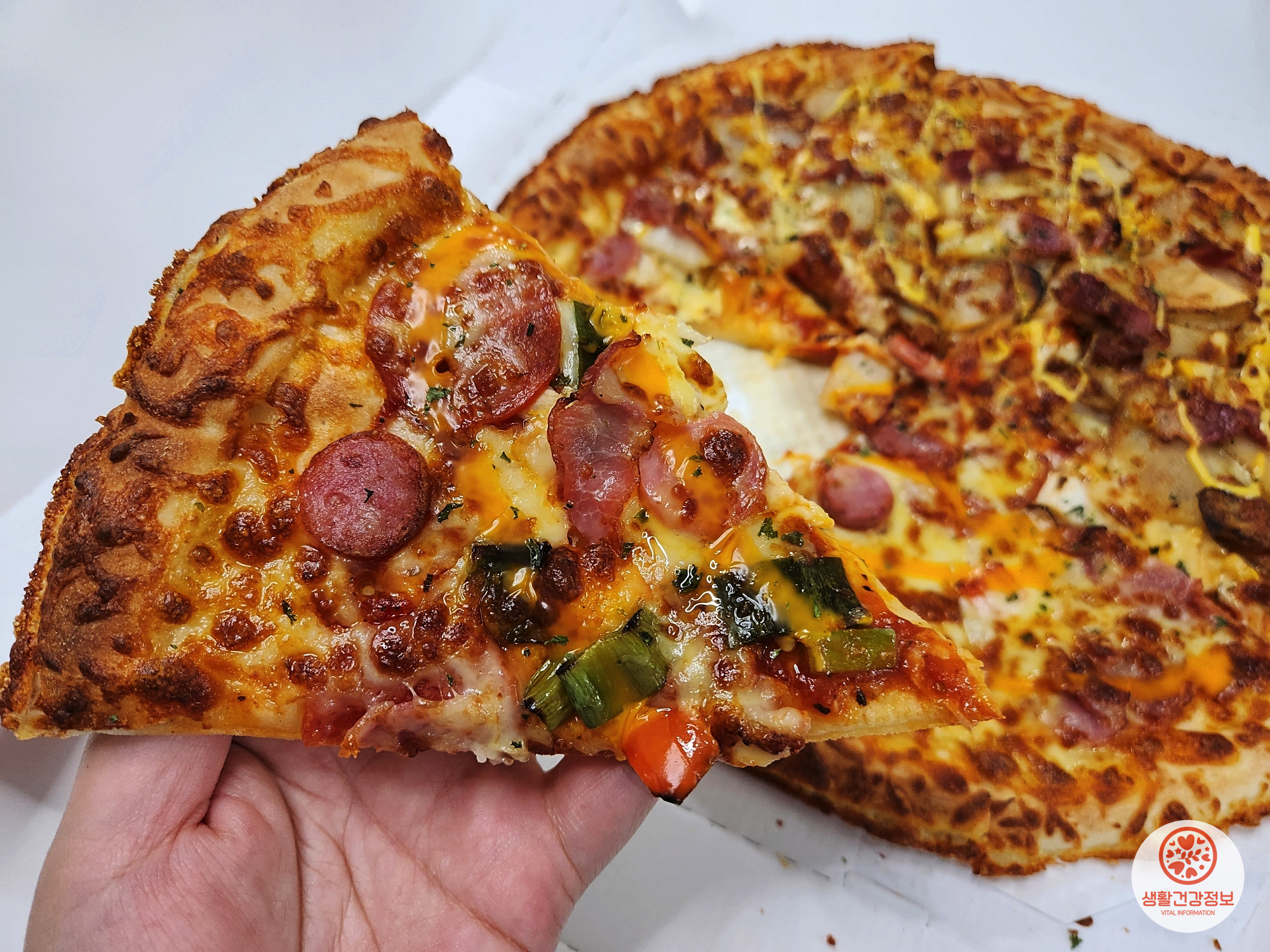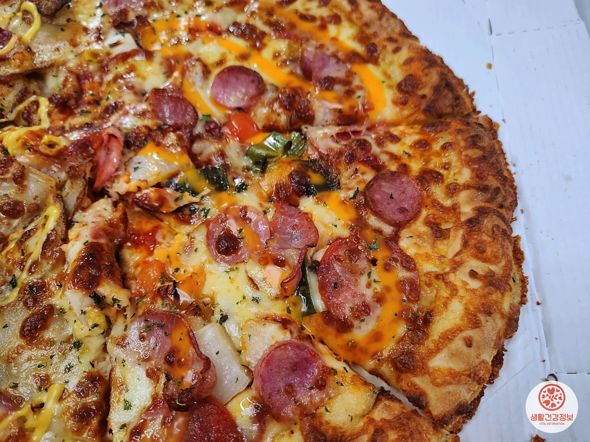 페퍼로니, 베이컨, 소시지, 파프리카 등이 토핑된