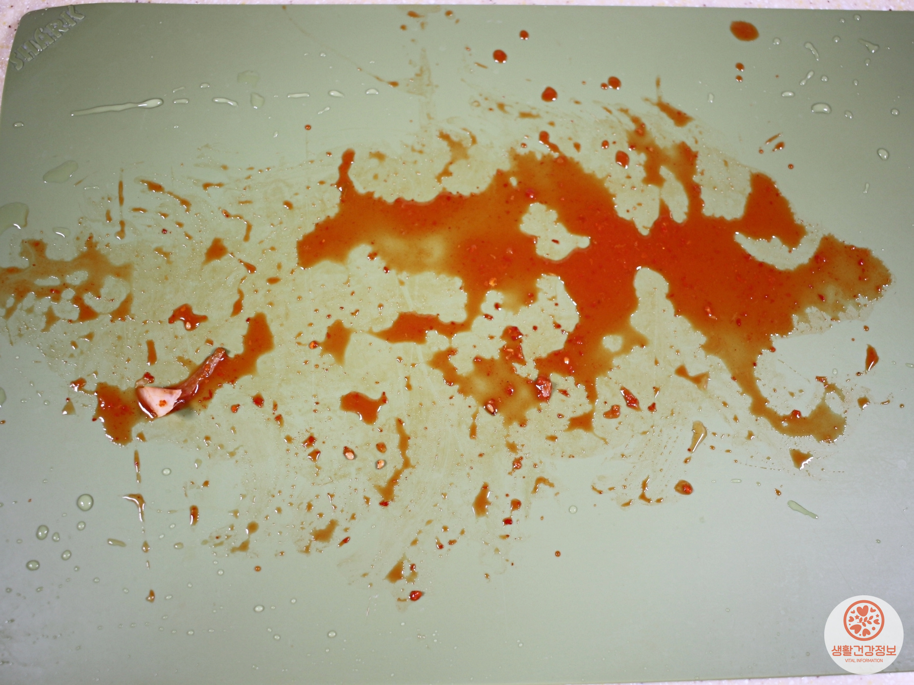 그 중 첫번째, 도마에 김치를 올려놓고 썰면