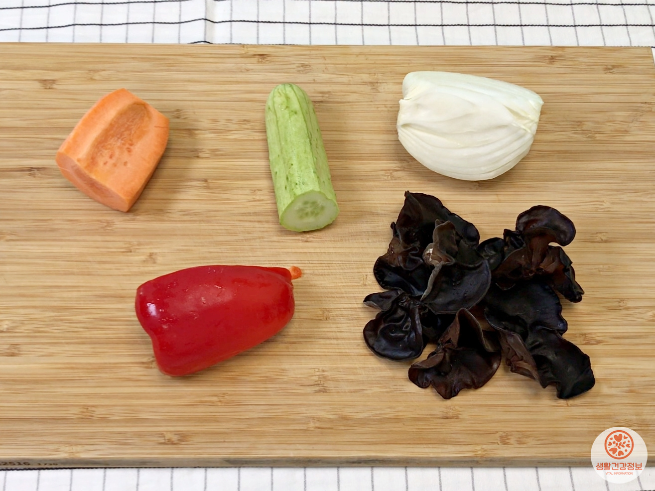 재료는 냉동만두, 당근, 오이, 양파, 파프리카, 목이버섯.