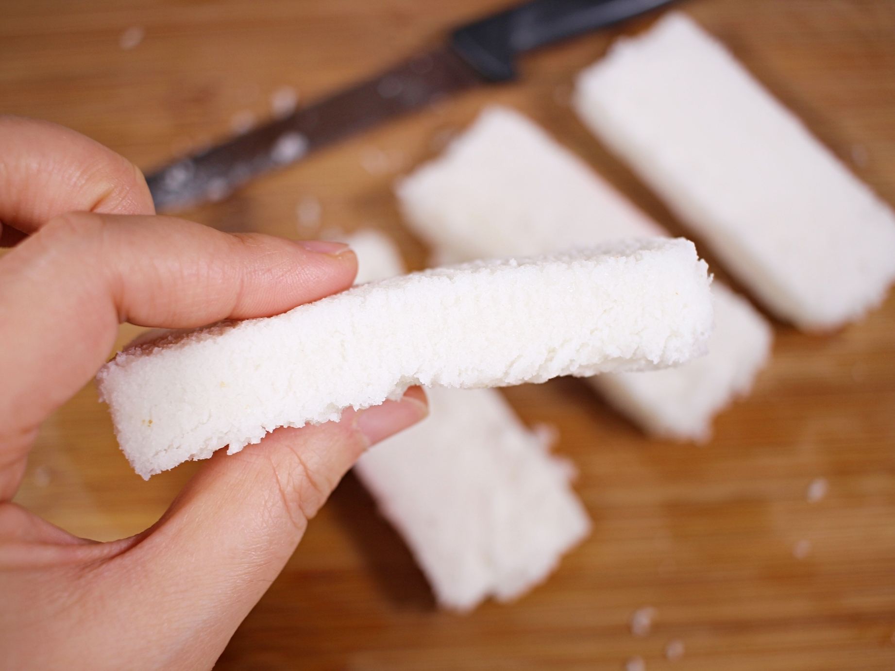 백설기를 먹기 좋은 크기로 잘라서 조각 내주세요.