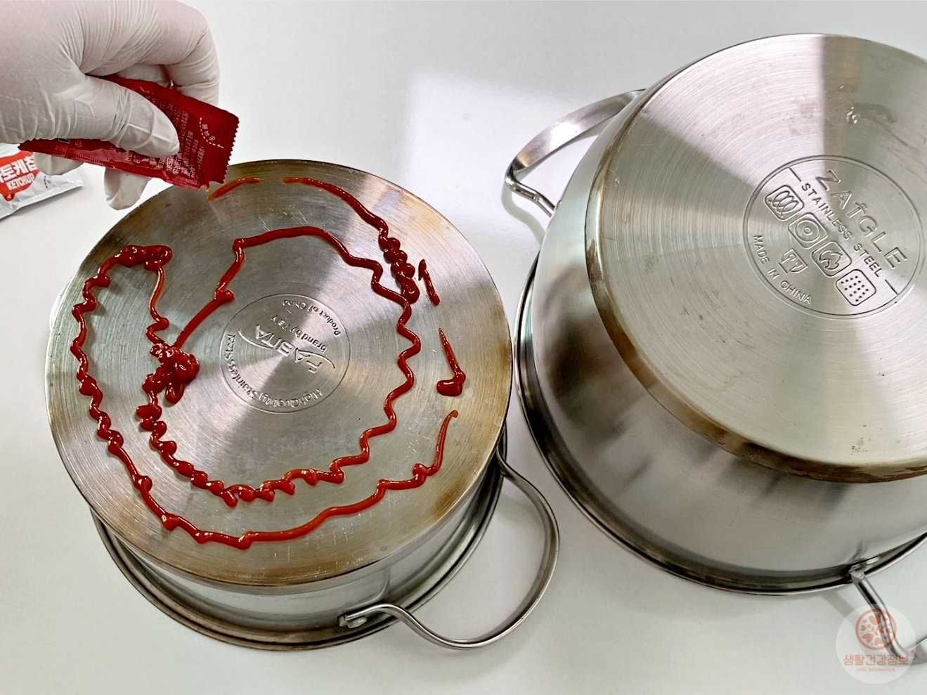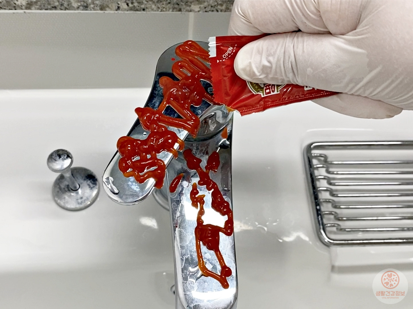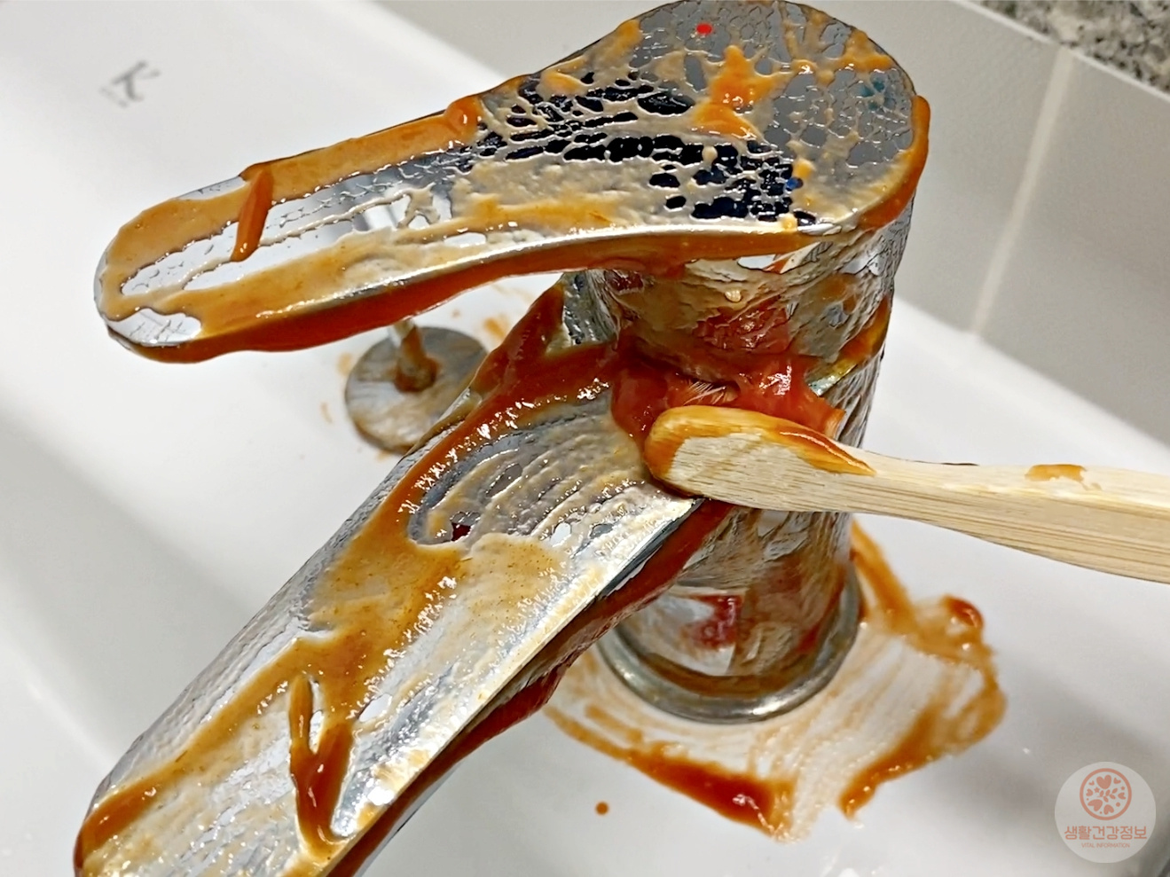 얼룩덜룩해진 수도꼭지에 일회용케첩을 쭉- 짜서