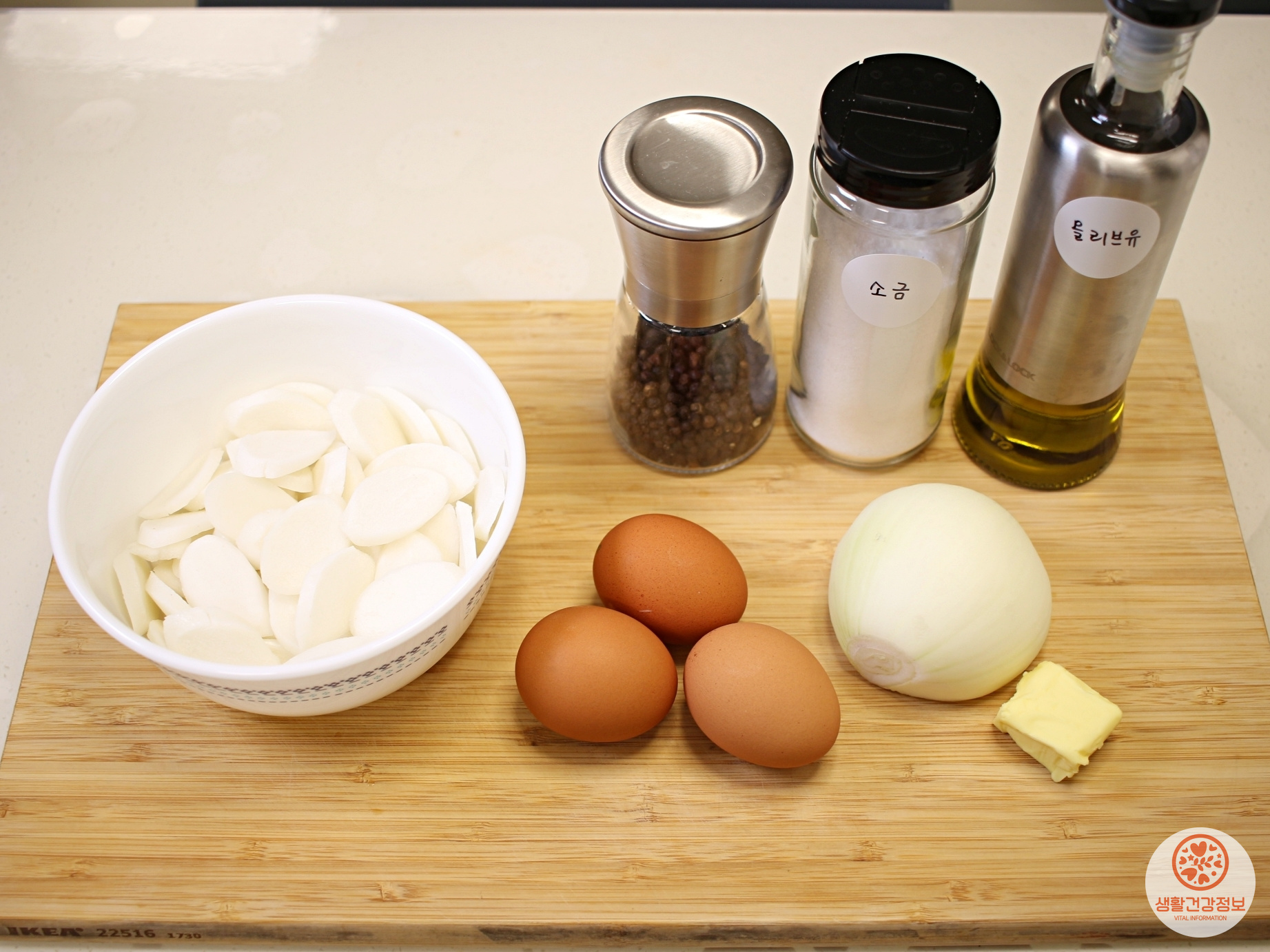 재료는 떡, 계란, 양파, 버터, 올리브유, 소금, 후추 준비해요.