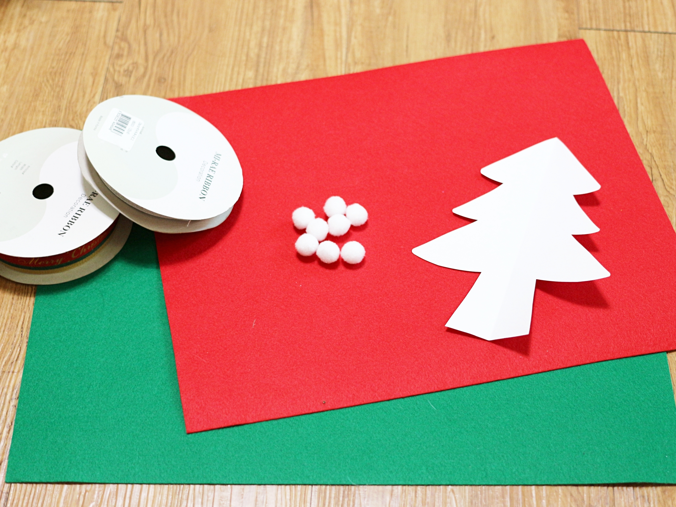 펠트지에 트리 모양 도안을 대고 밑그림을 그려요.