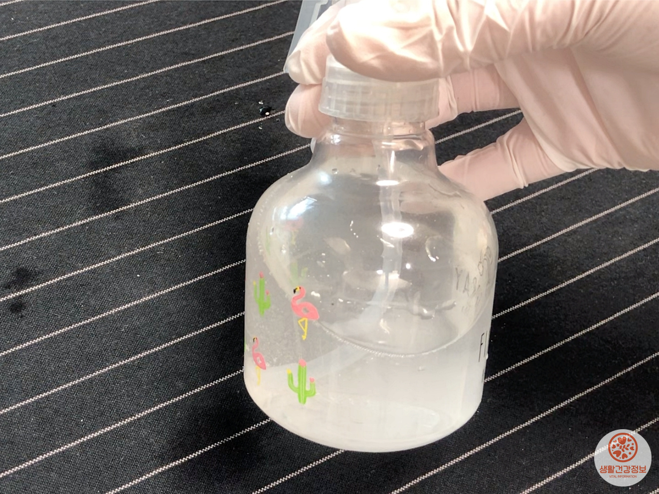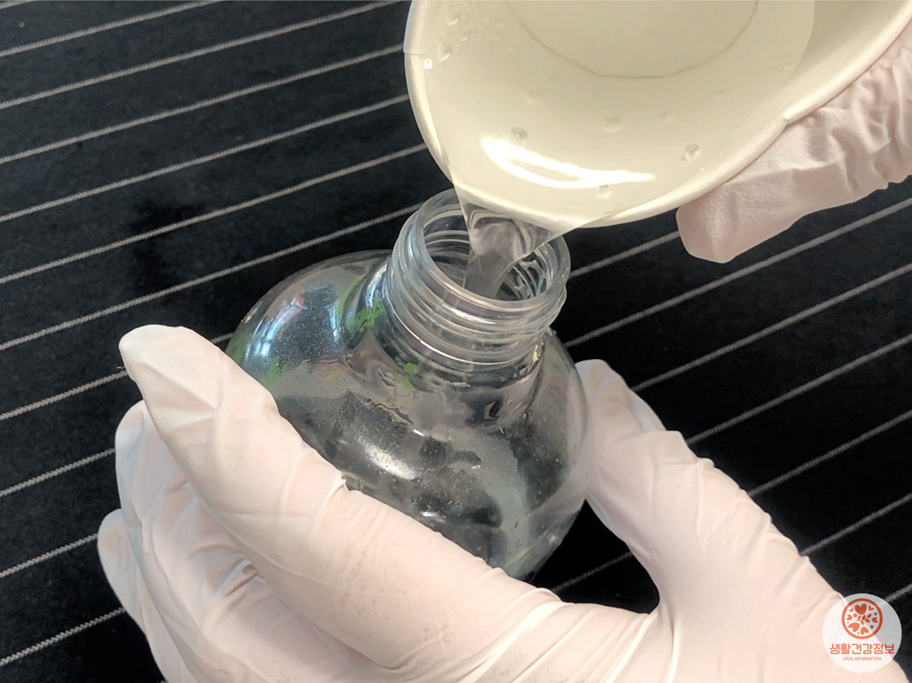스프레이에 종이컵으로 물을 한컵 붓고