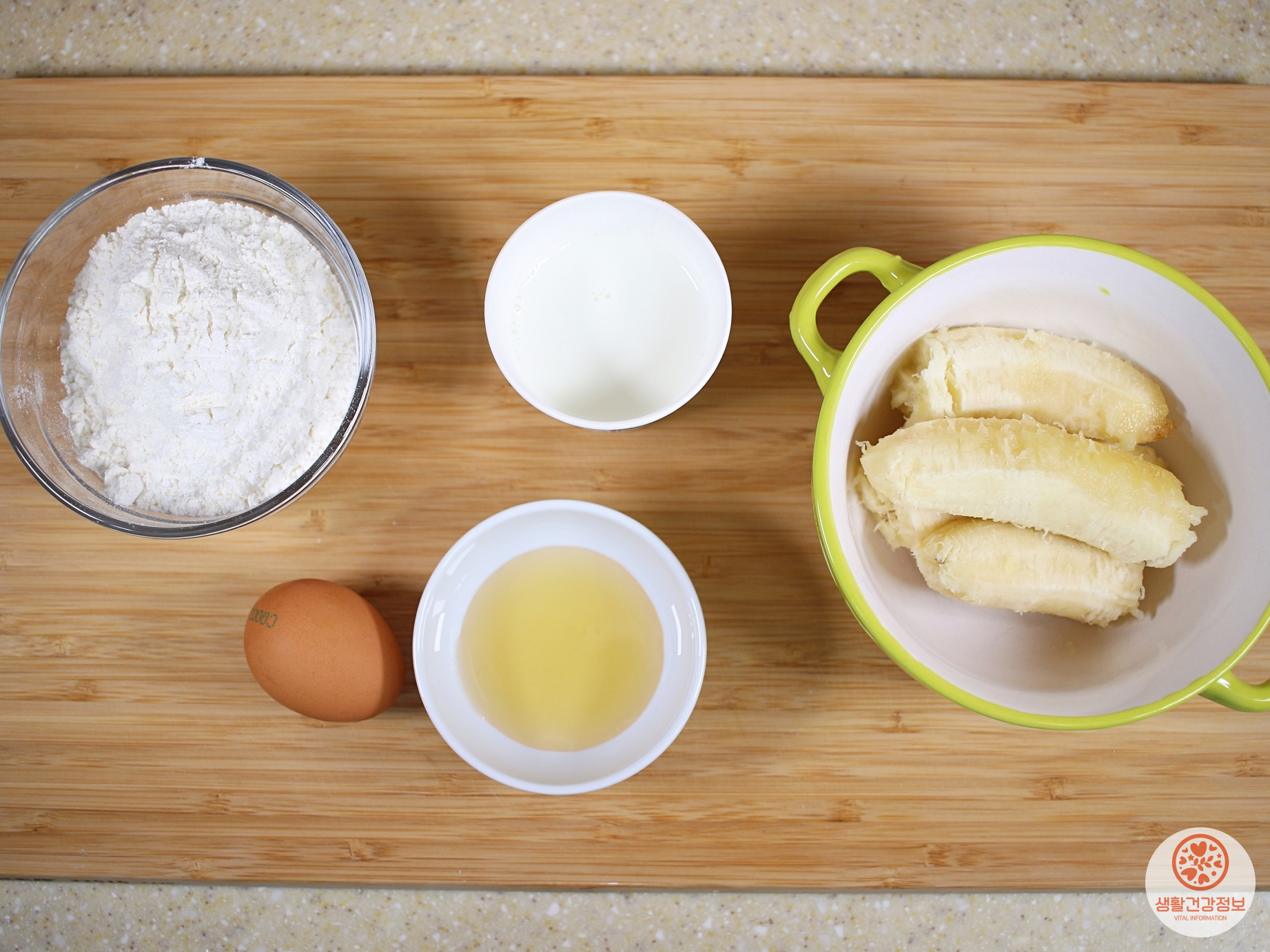 재료는 바나나, 핫케이크가루, 달걀, 우유, 꿀 준비해요.