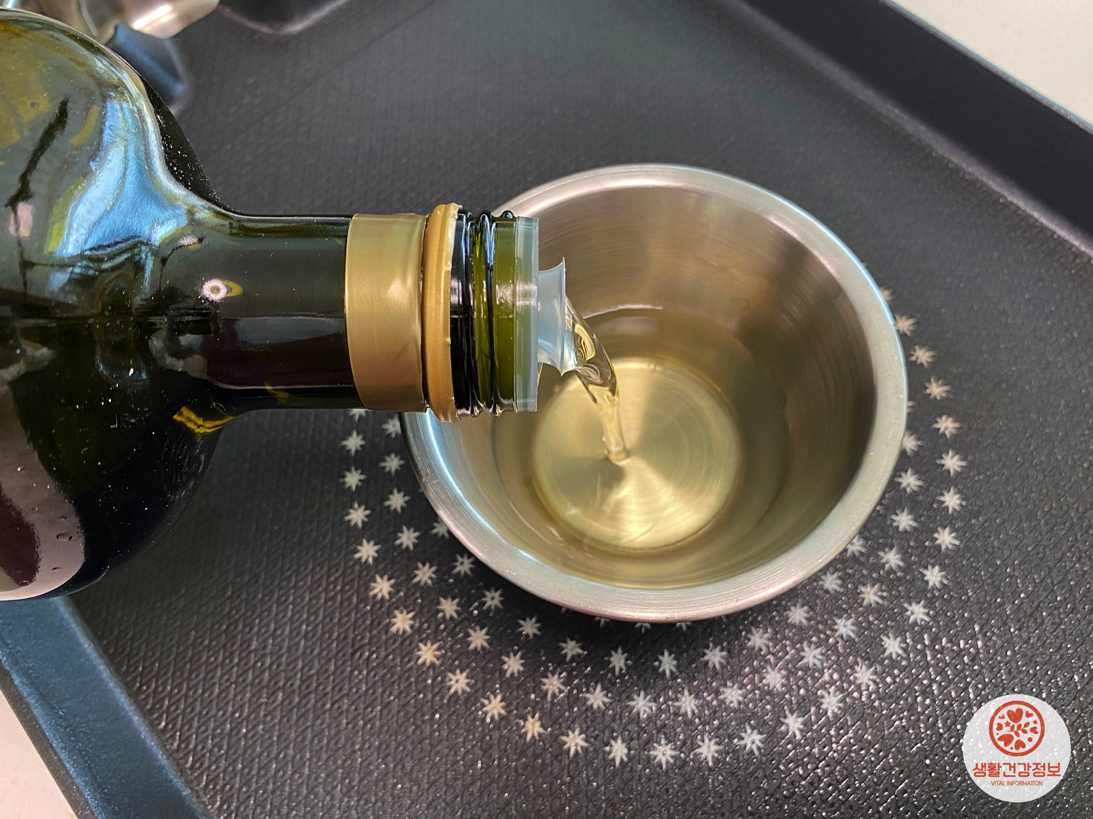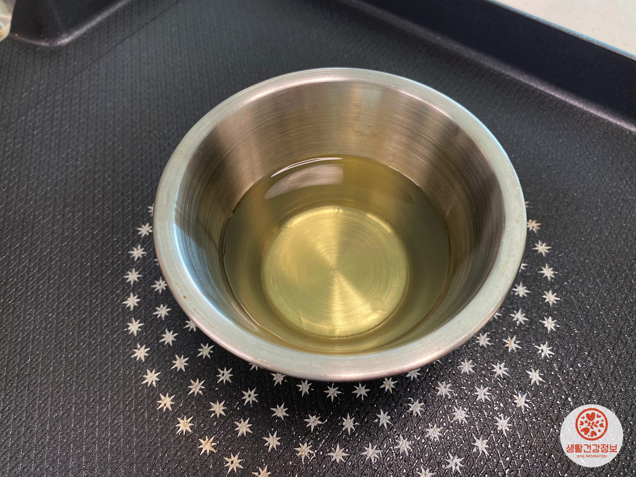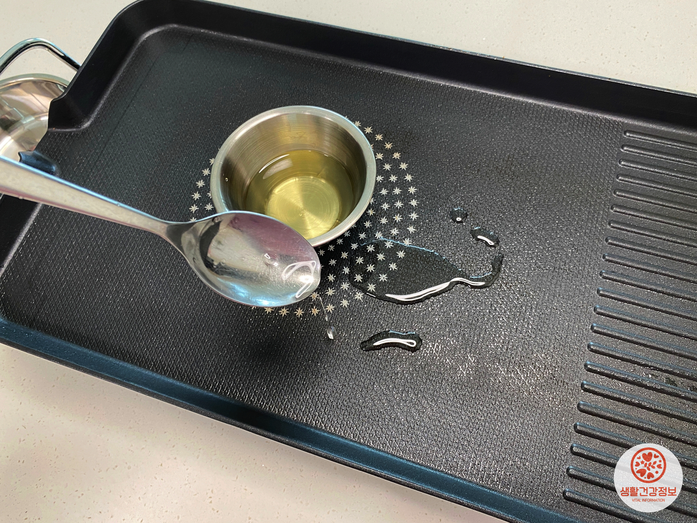 프라이팬 위에 기름종지를 올리고