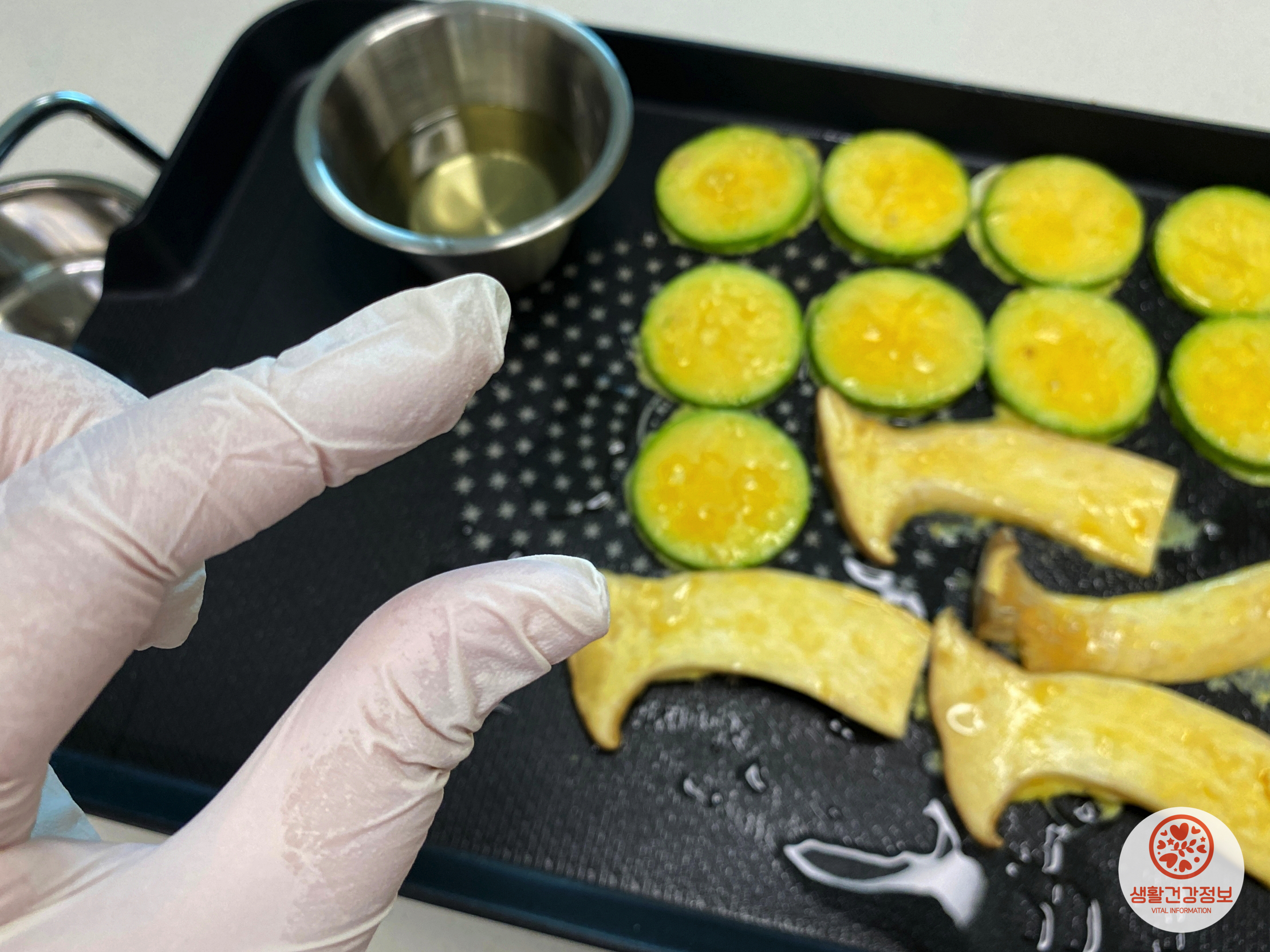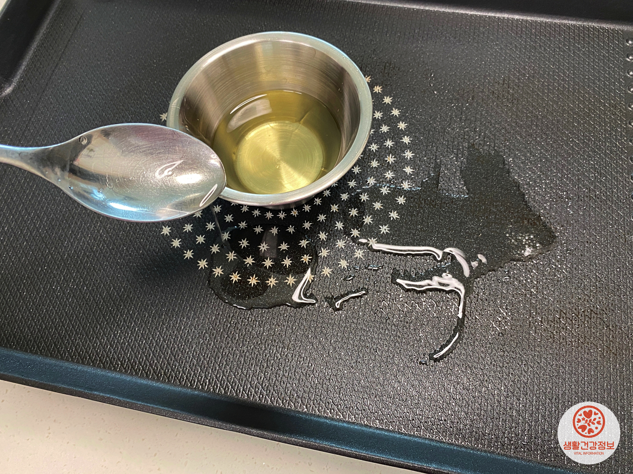 프라이팬 위에 기름종지를 올리고