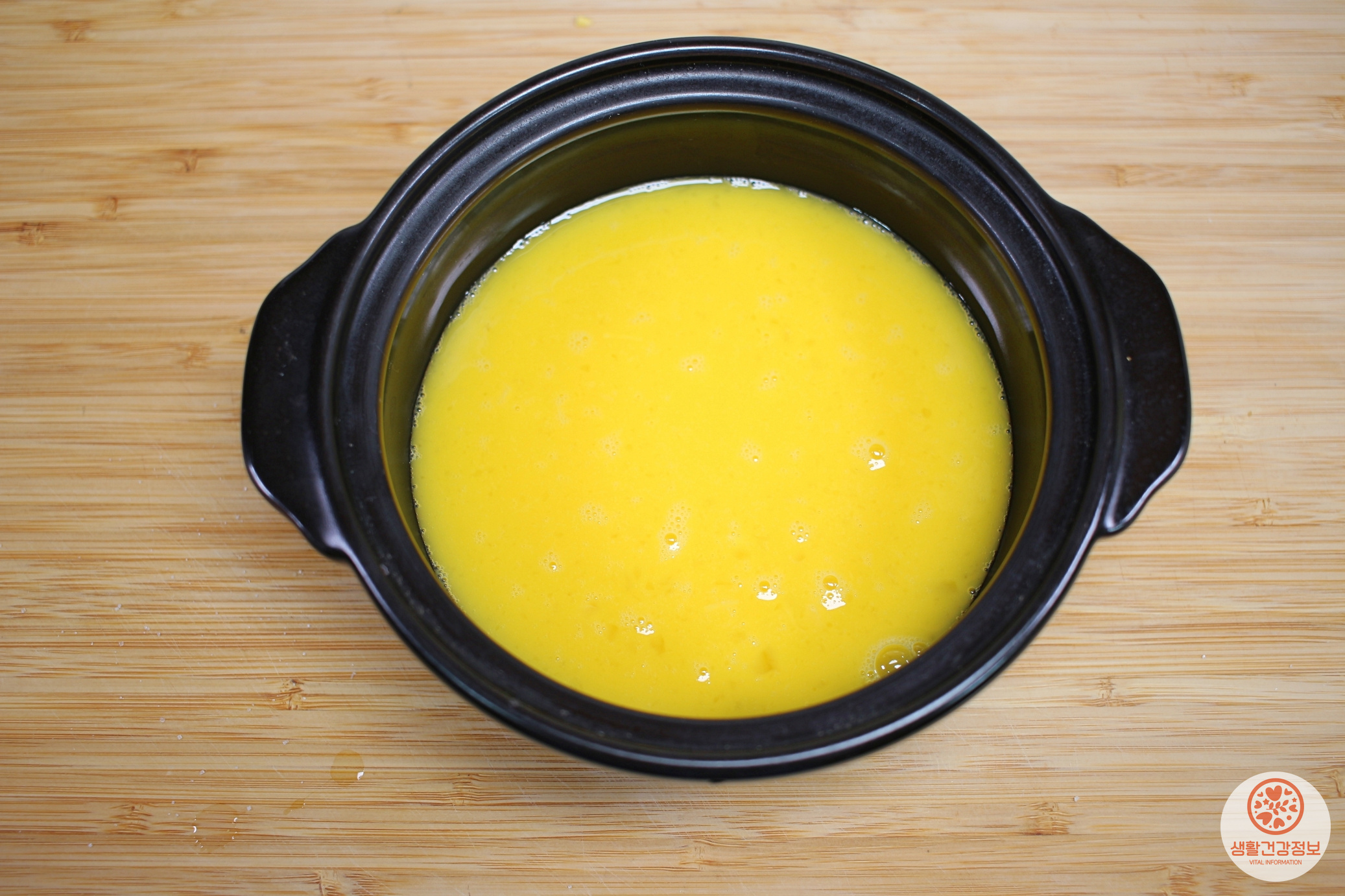 뚝배기에 계란물을 붓고 약불로 조리를 시작해요.