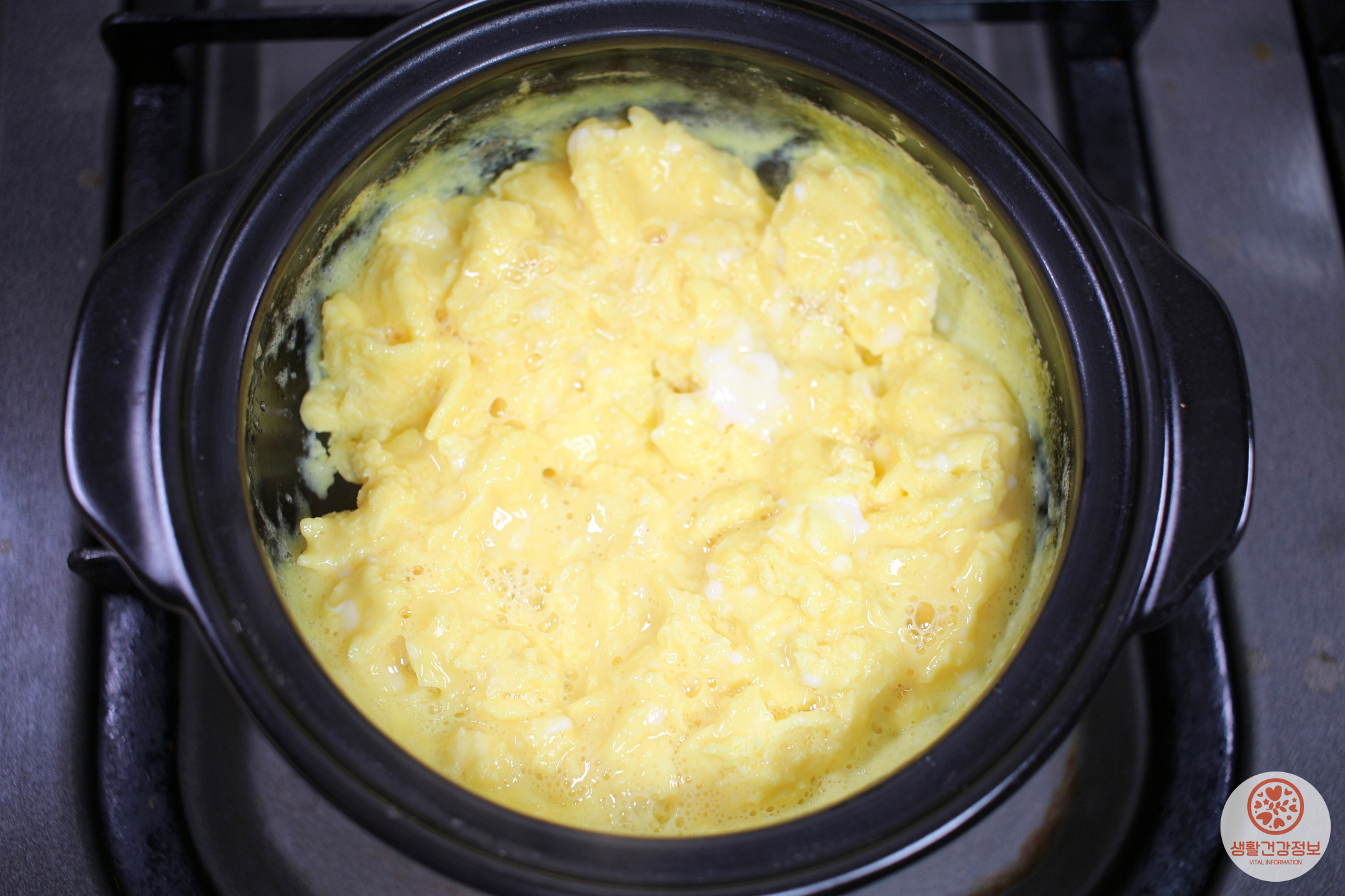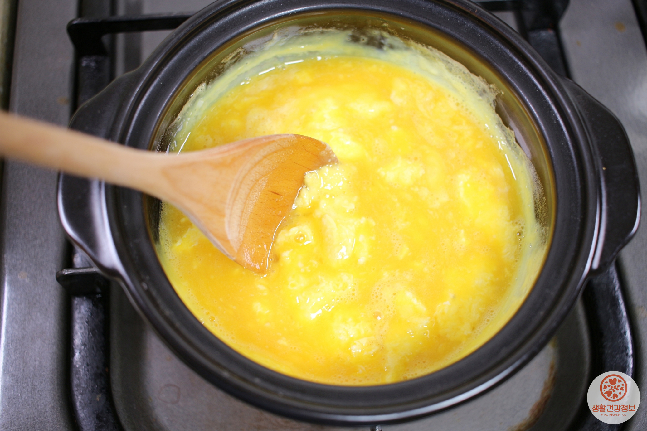 뚝배기에 계란물을 붓고 약불로 조리를 시작해요.