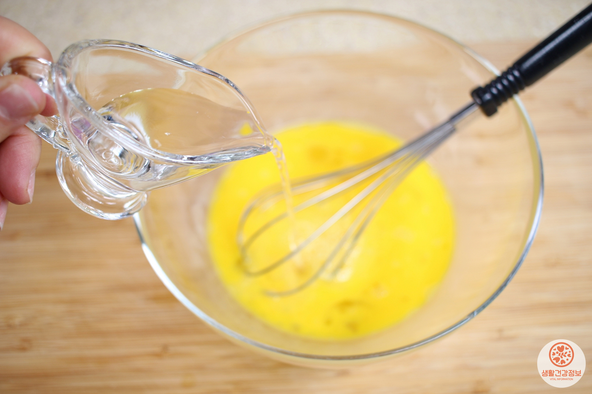 계란6개 곱게 풀고, 물 3큰술 넣어서