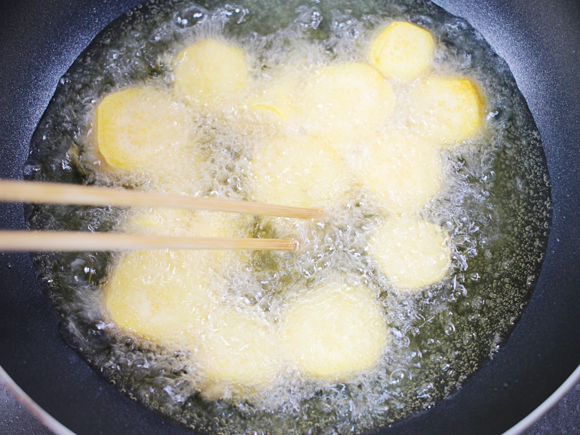 일반적으로 기름을 먼저 달군 뒤 고구마를 넣지만