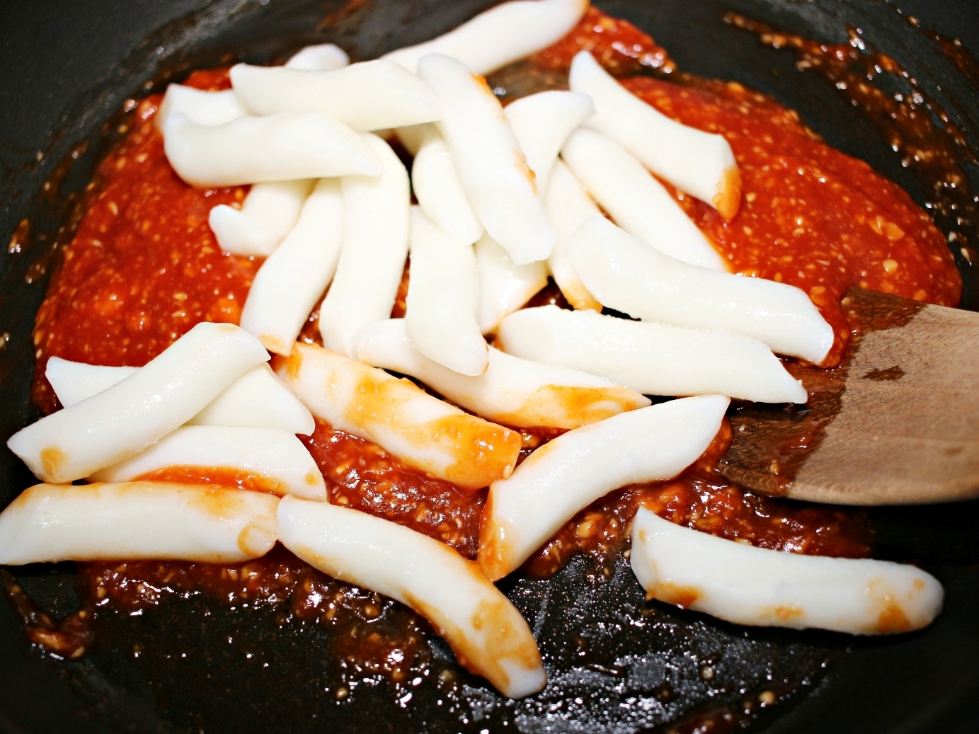 말랑하게 해동한 떡을 넣고 볶아주세요.