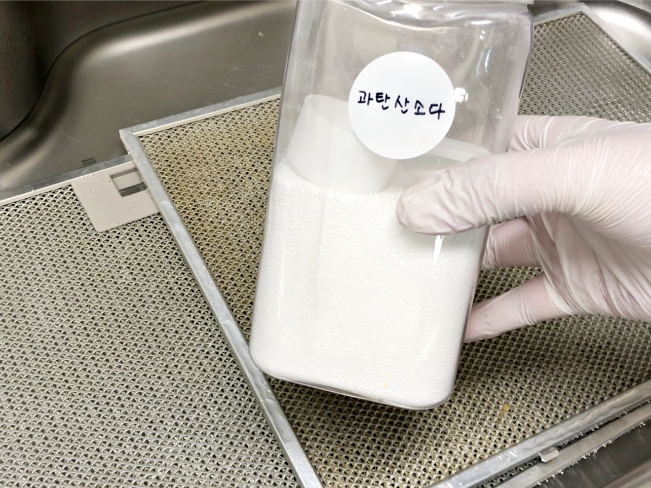 과탄산소다를 뿌린 필터 위에