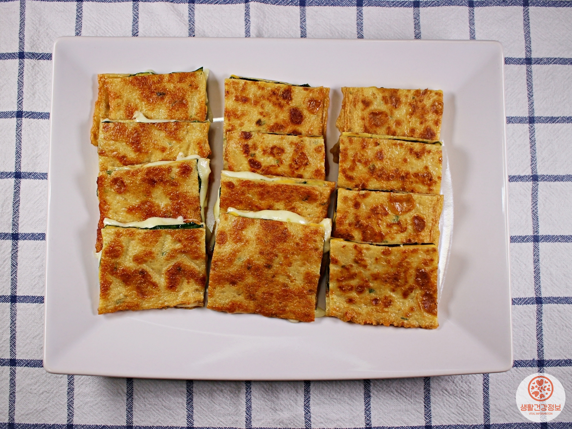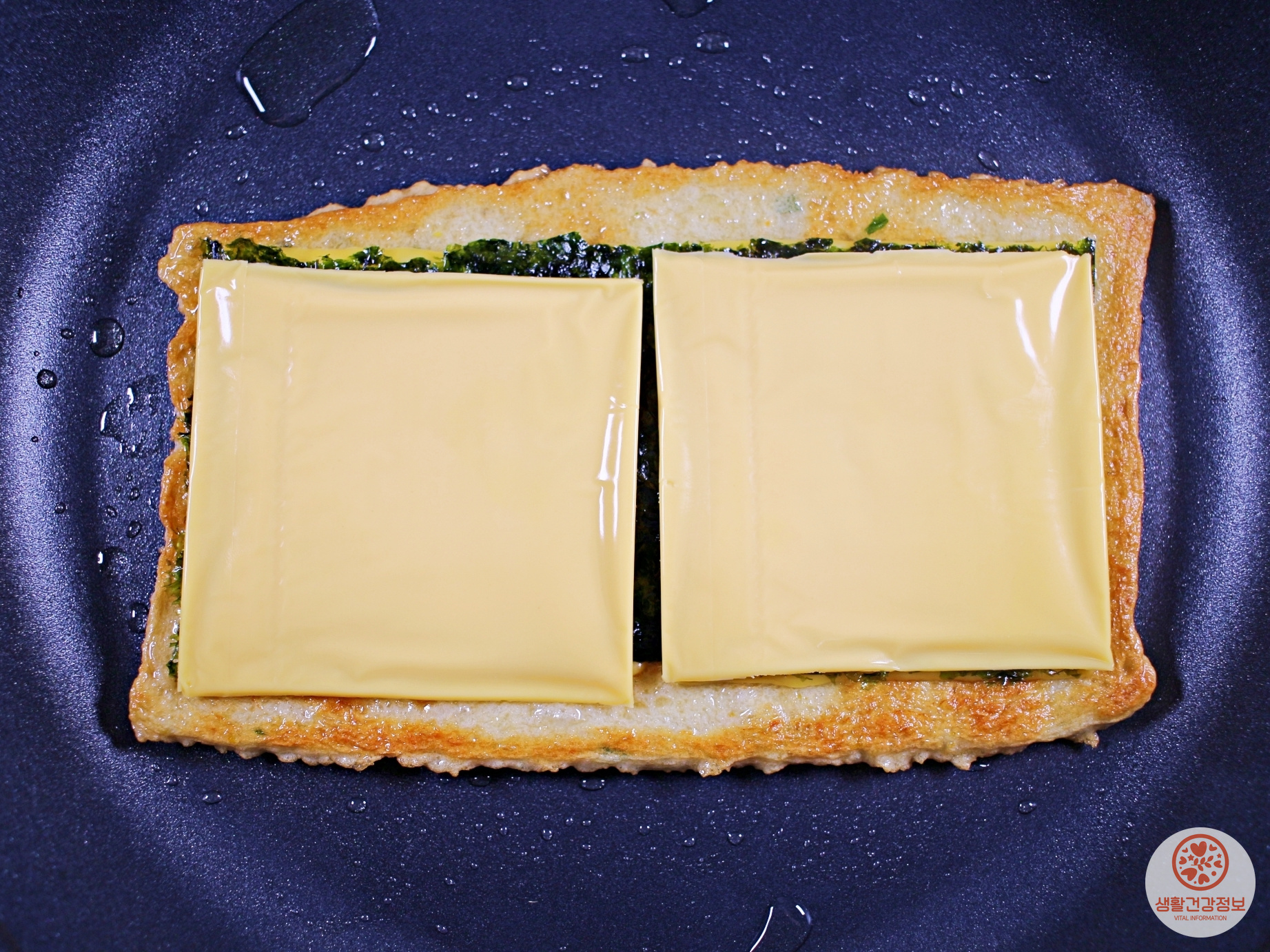 다시 치즈 한장 올리고 사각어묵 덮어서 마무리해요.