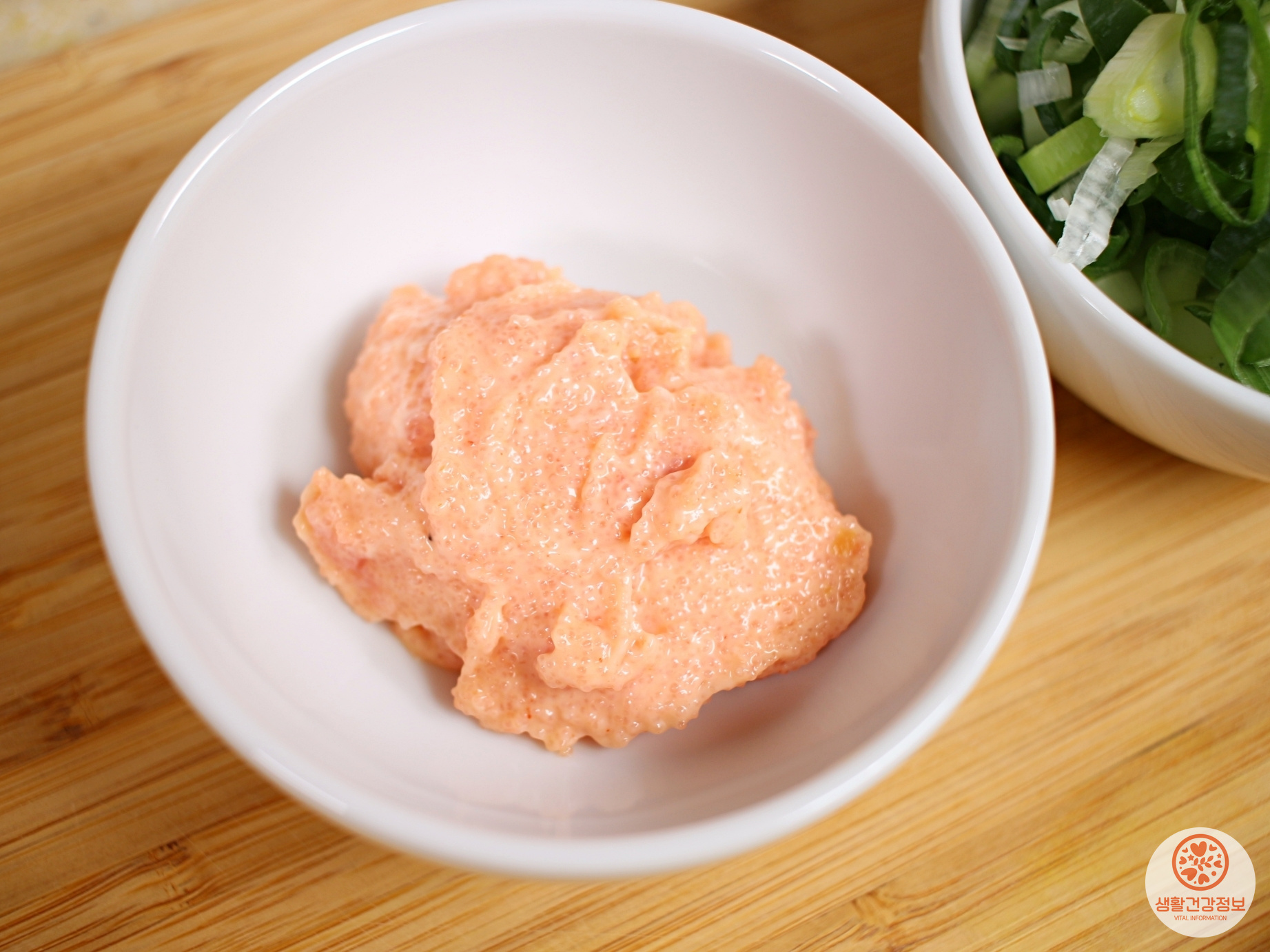 명란젓과 마요네즈를 1:1로 섞어서 만들었어요.
