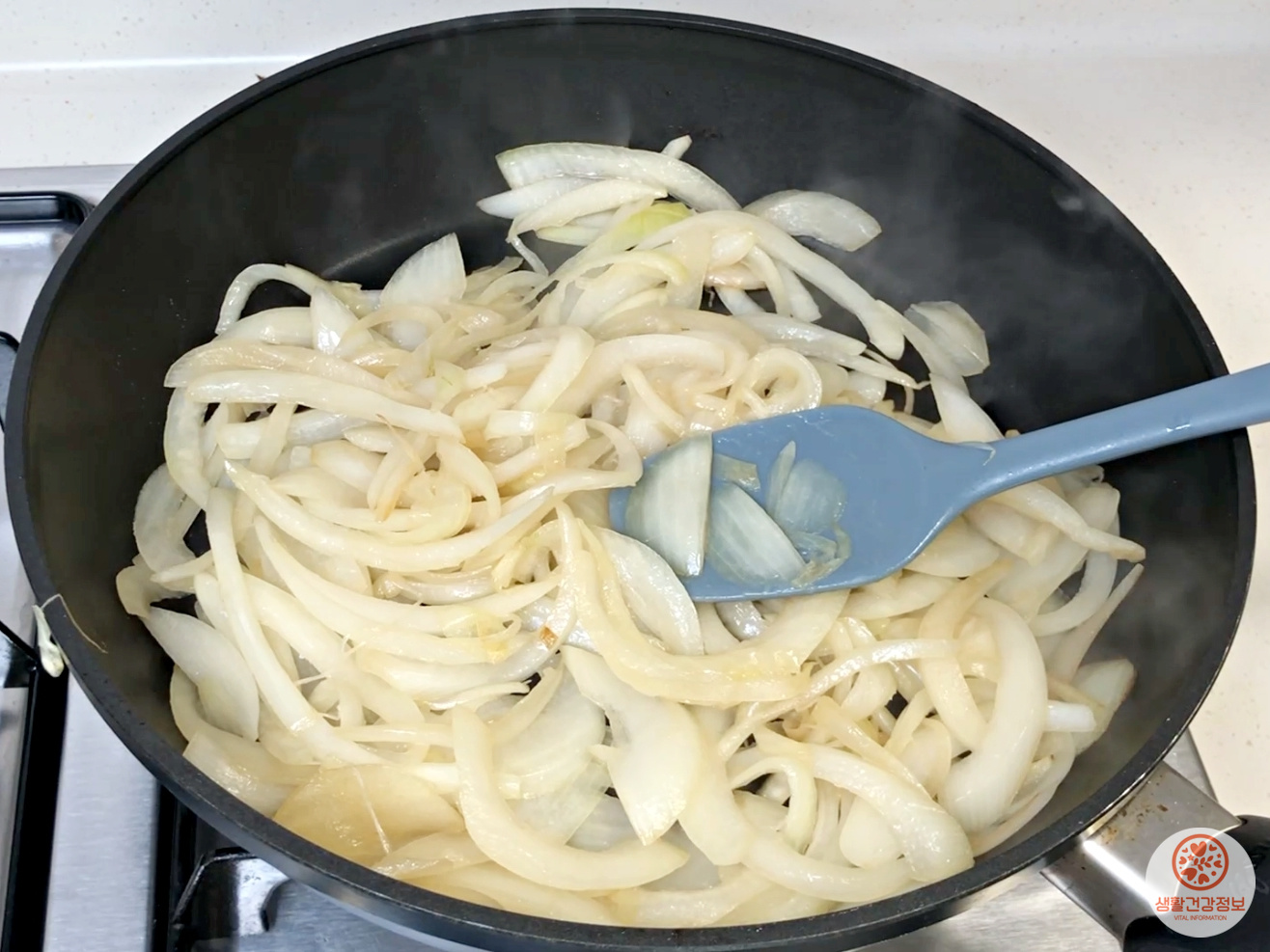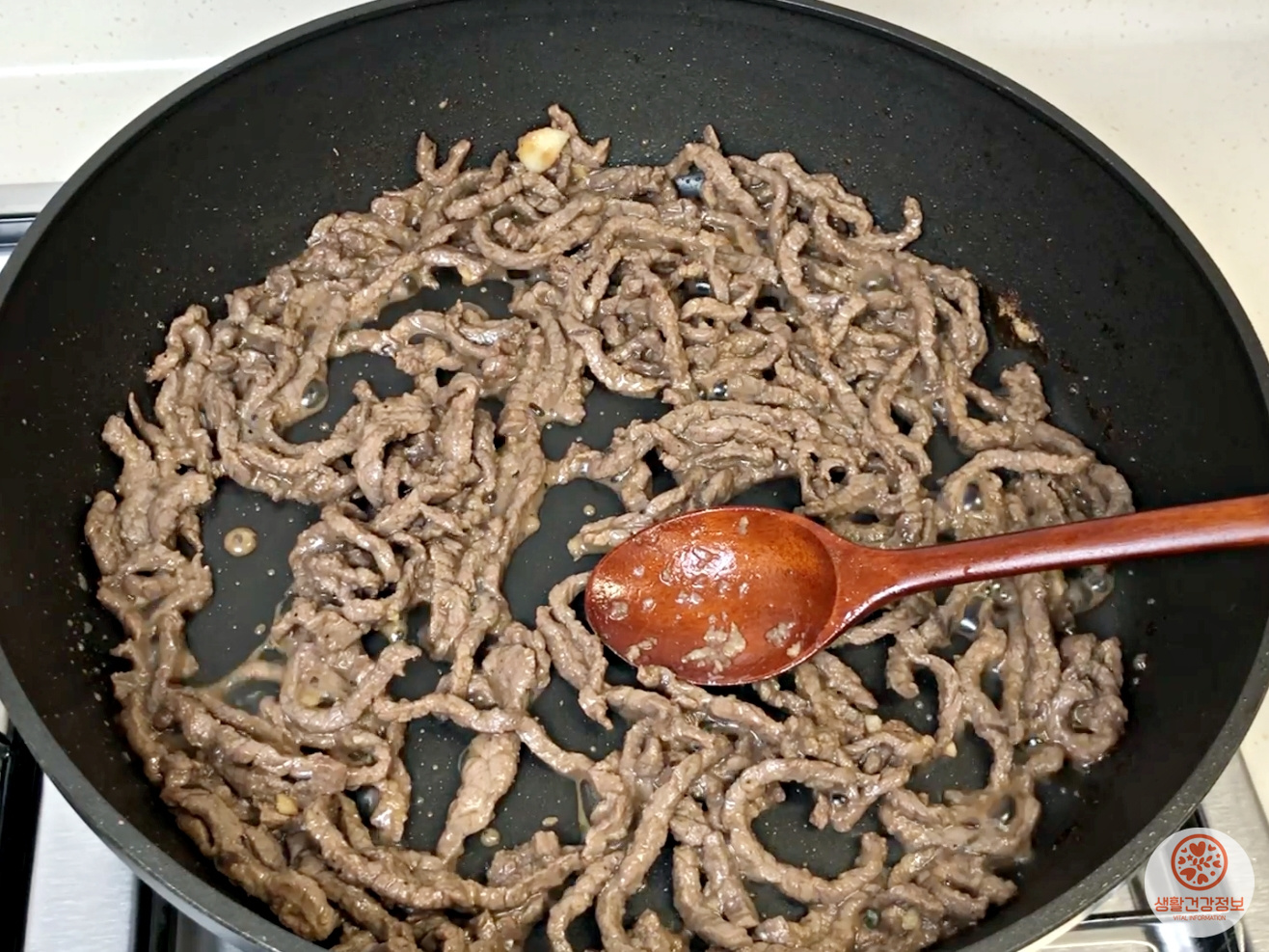 양파까지 다 볶고 나면 미리 양념한 소고기를 볶아주세요.