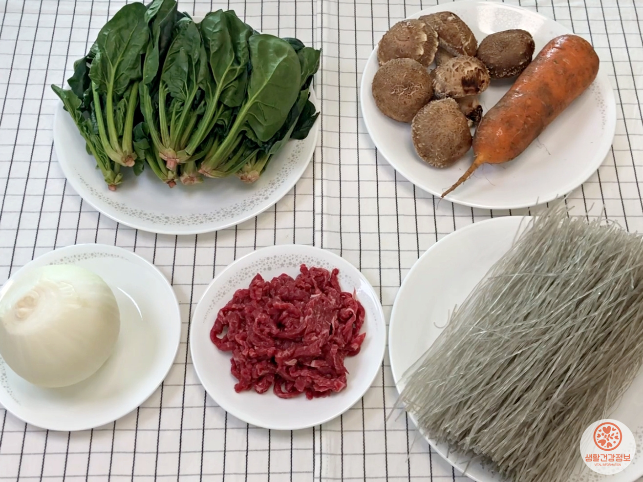 재료는 당면, 시금치, 표고버섯, 당근, 양파, 소고기 준비했어요.