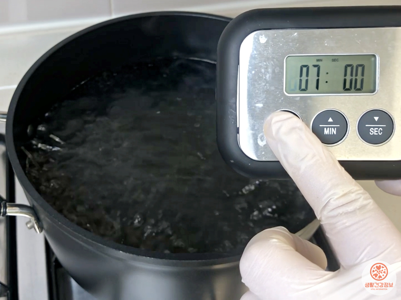 7분동안 삶고 바로 건져내서 물기를 빼주세요.