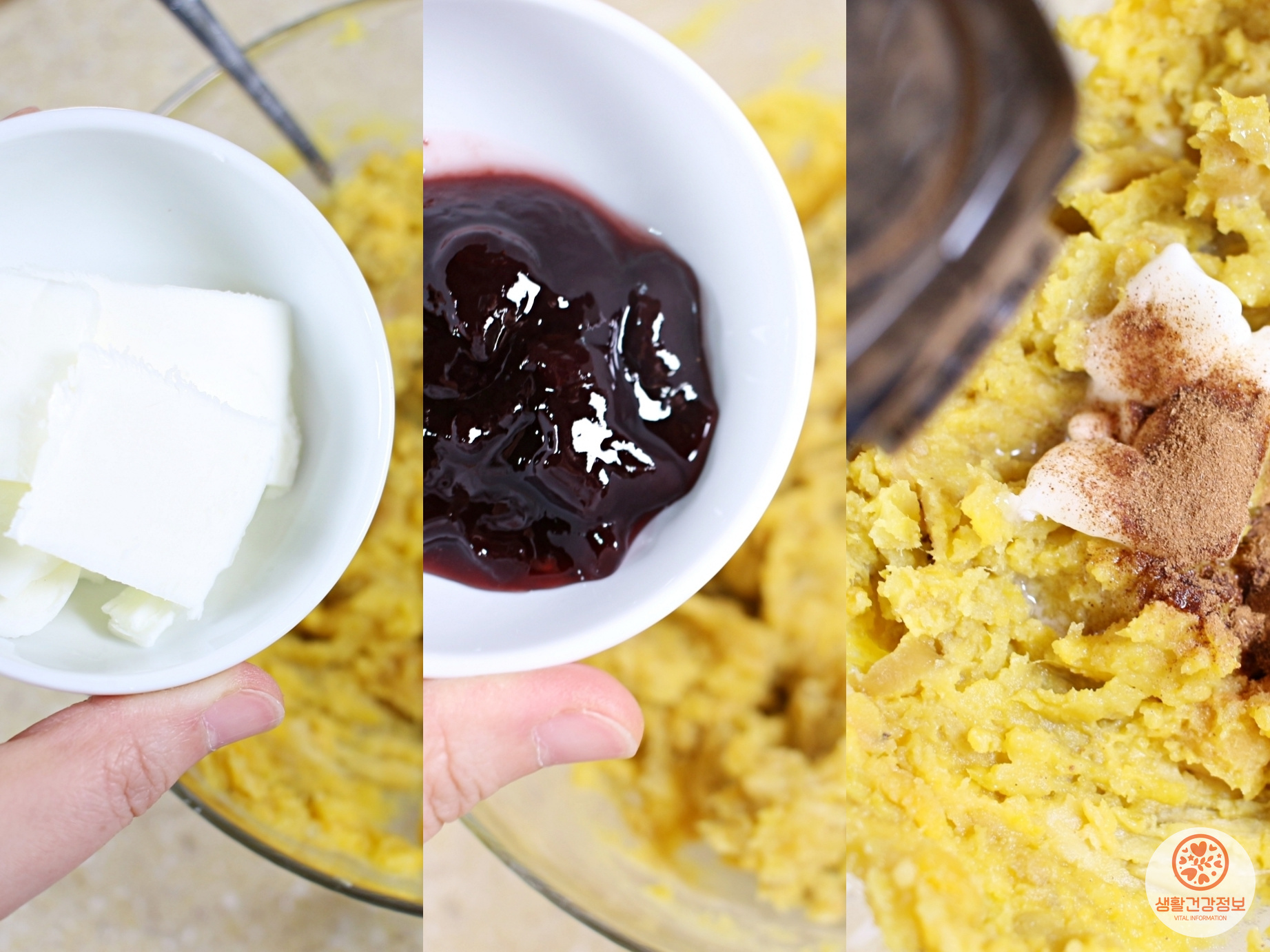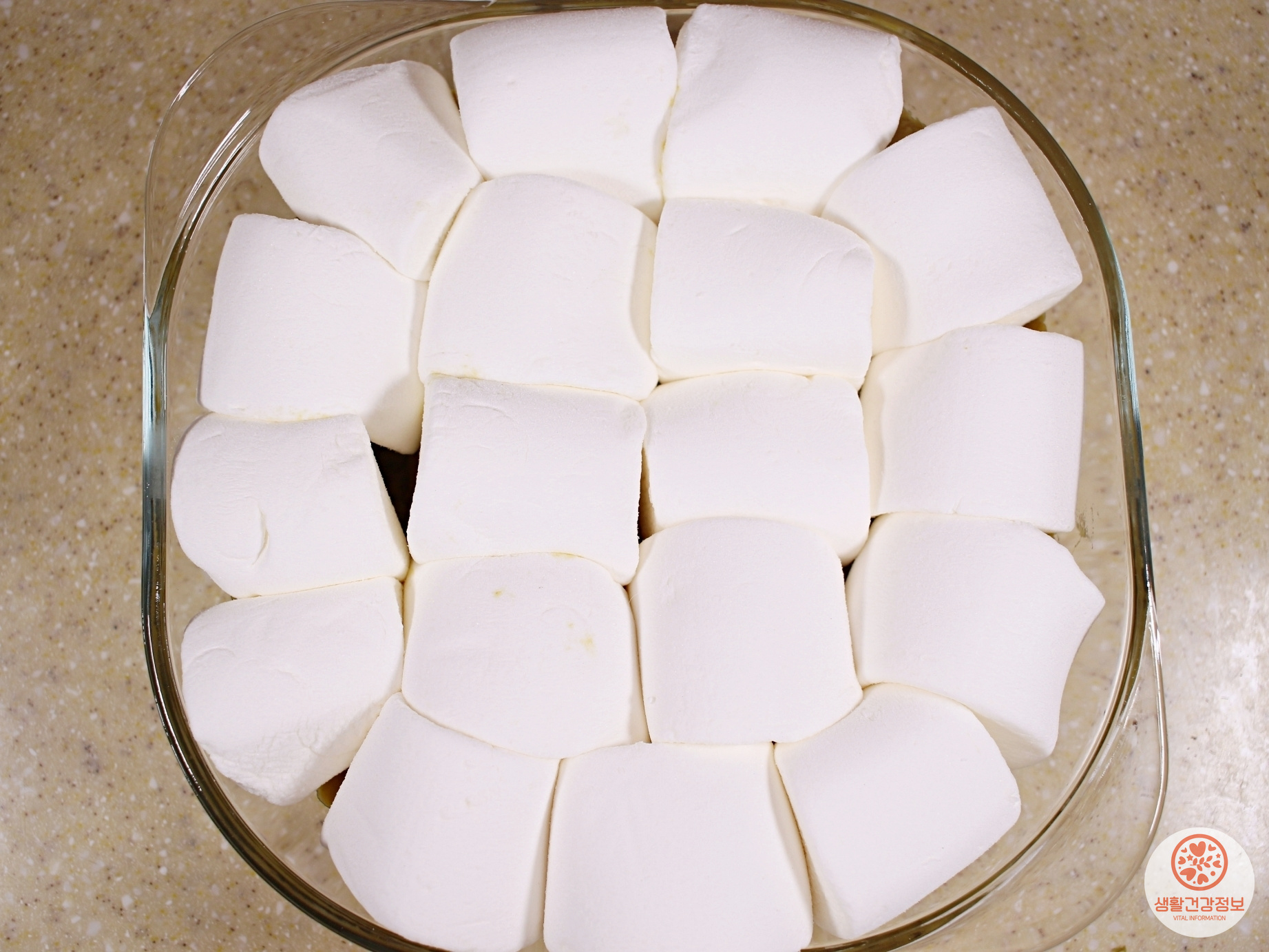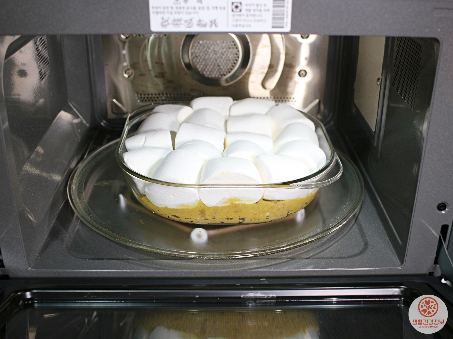 오븐용 그릇에 고구마를 다져서 넣고요.