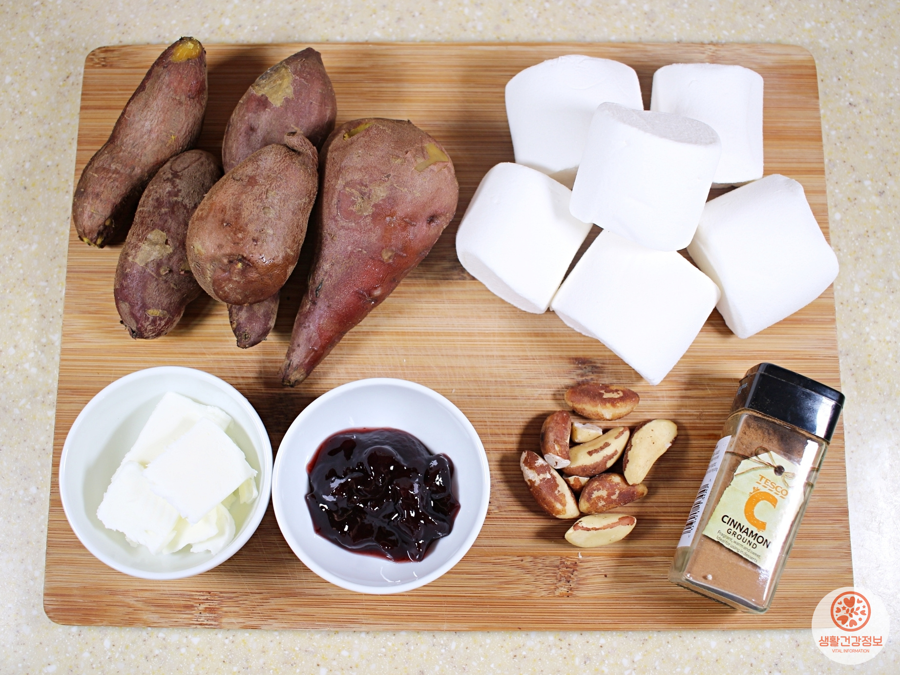 재료는 고구마, 마시멜로, 버터, 잼, 견과류, 시나몬가루 준비해요.