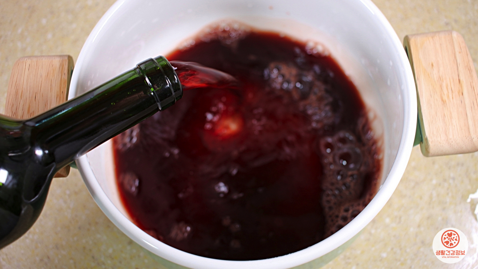 냄비에 와인 한병을 몽땅 부어주시고요.