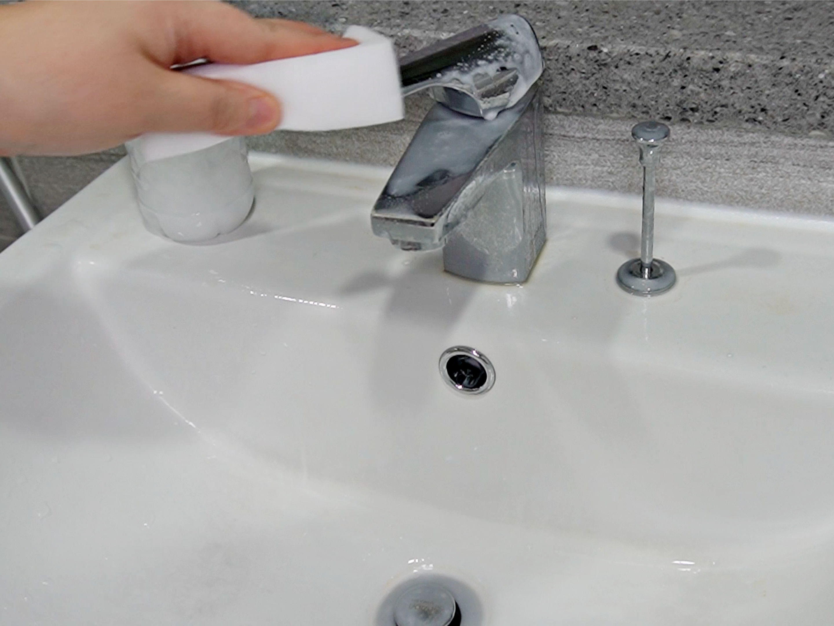 세면대나 욕조 등 욕실 구석구석 치약물을 뿌리고 닦아보세요.