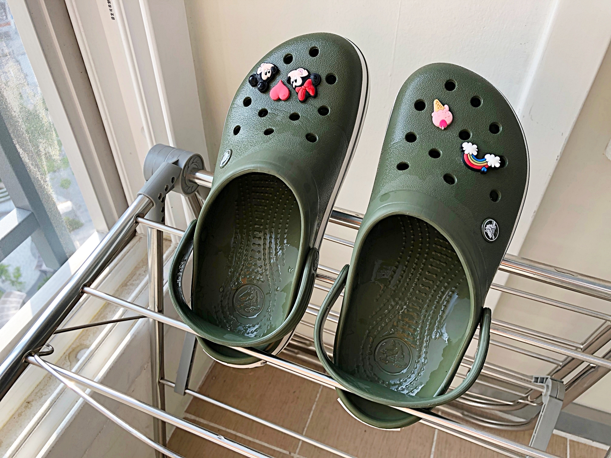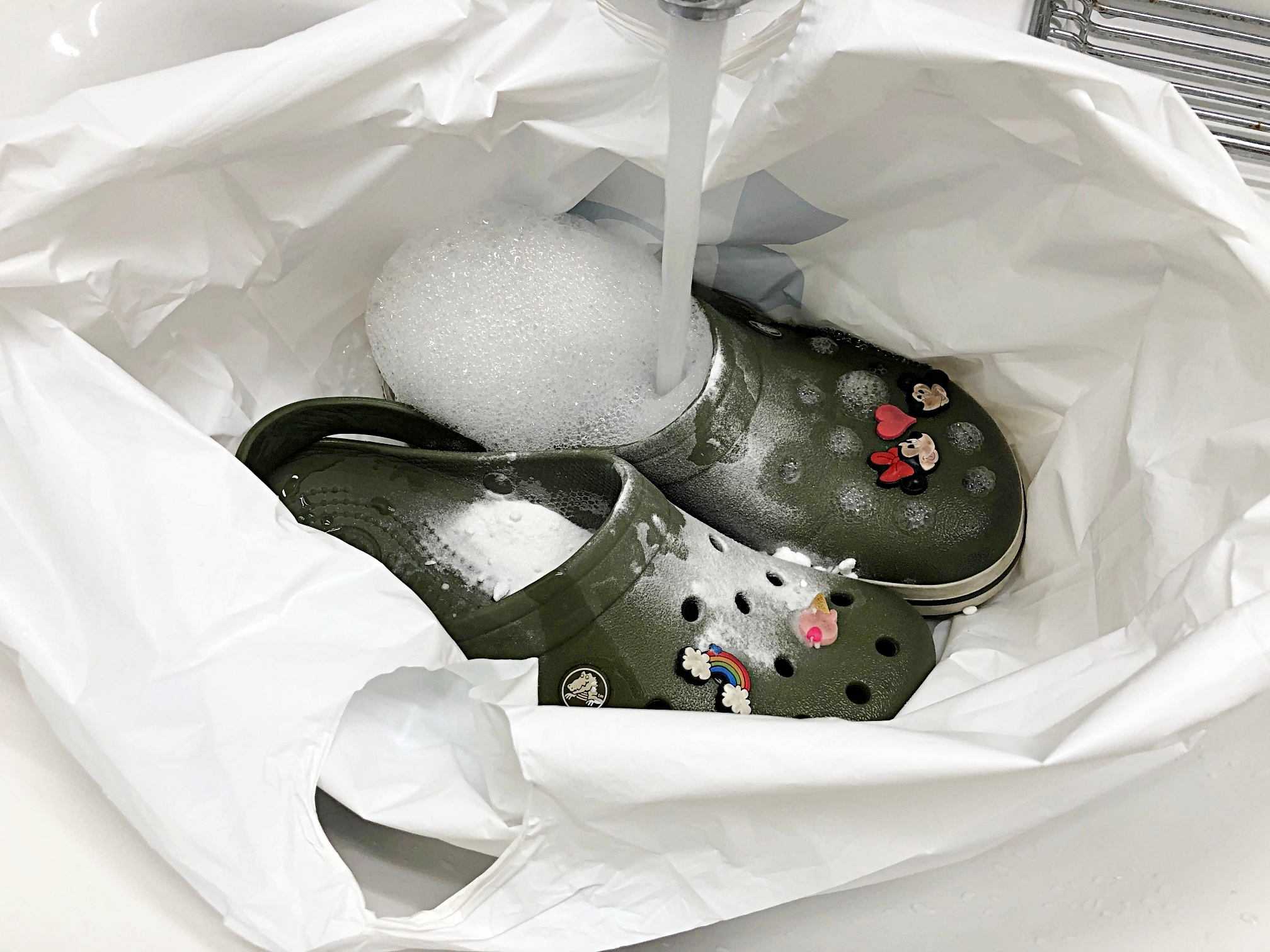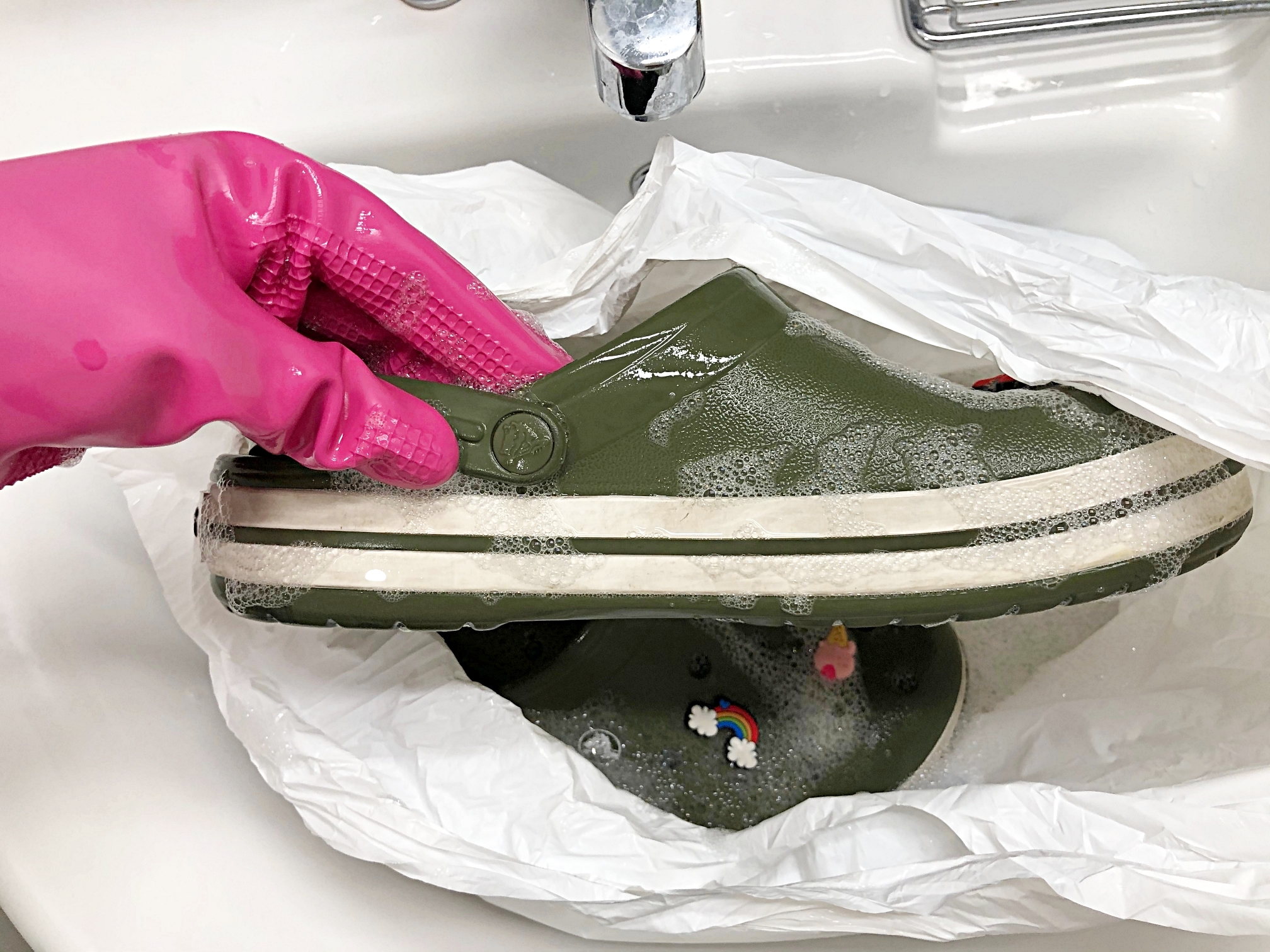 우선 크록스를 미지근한 물로 헹궈주세요.
