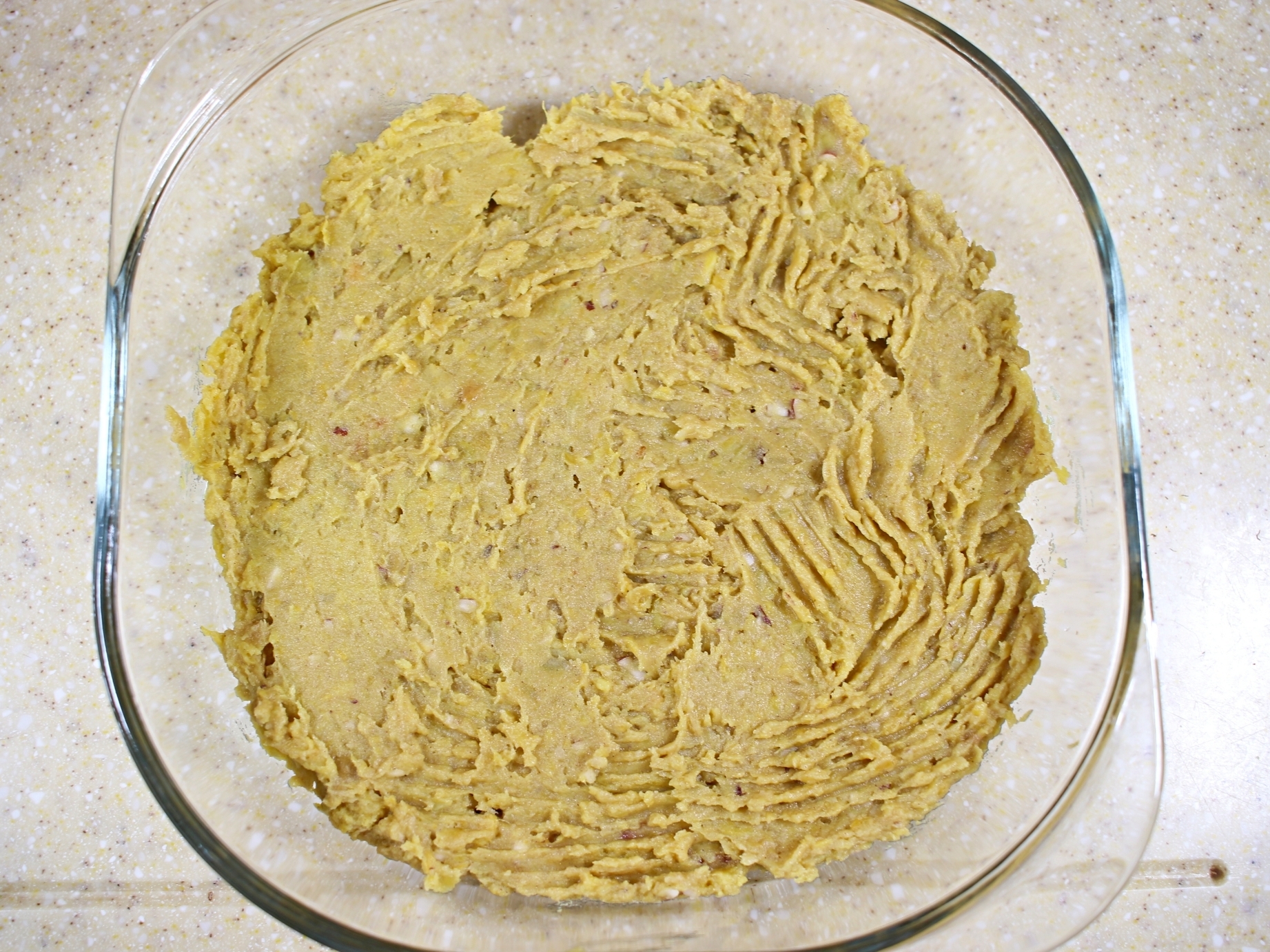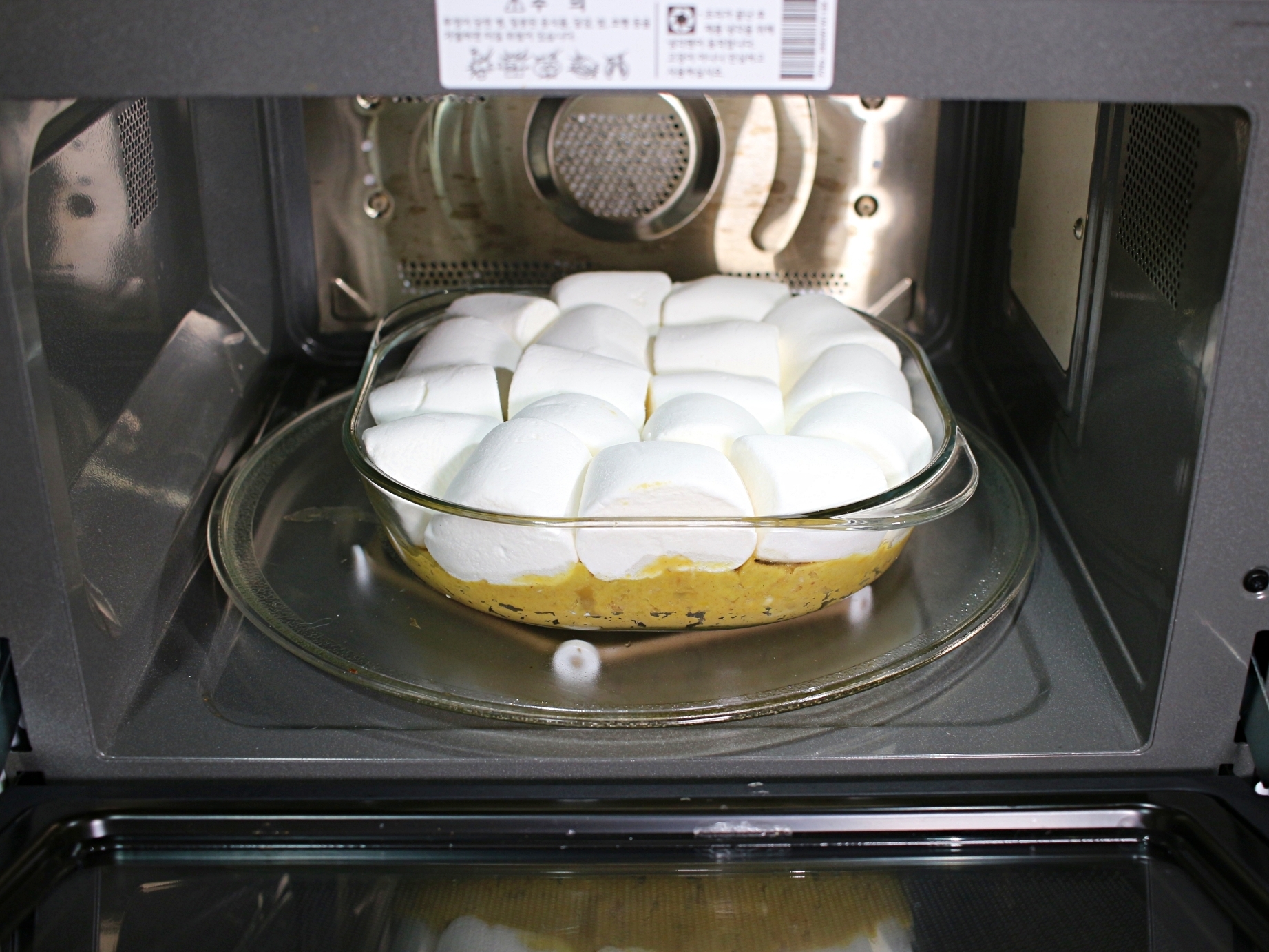 오븐용 그릇에 고구마 반죽을 고르게 담고,